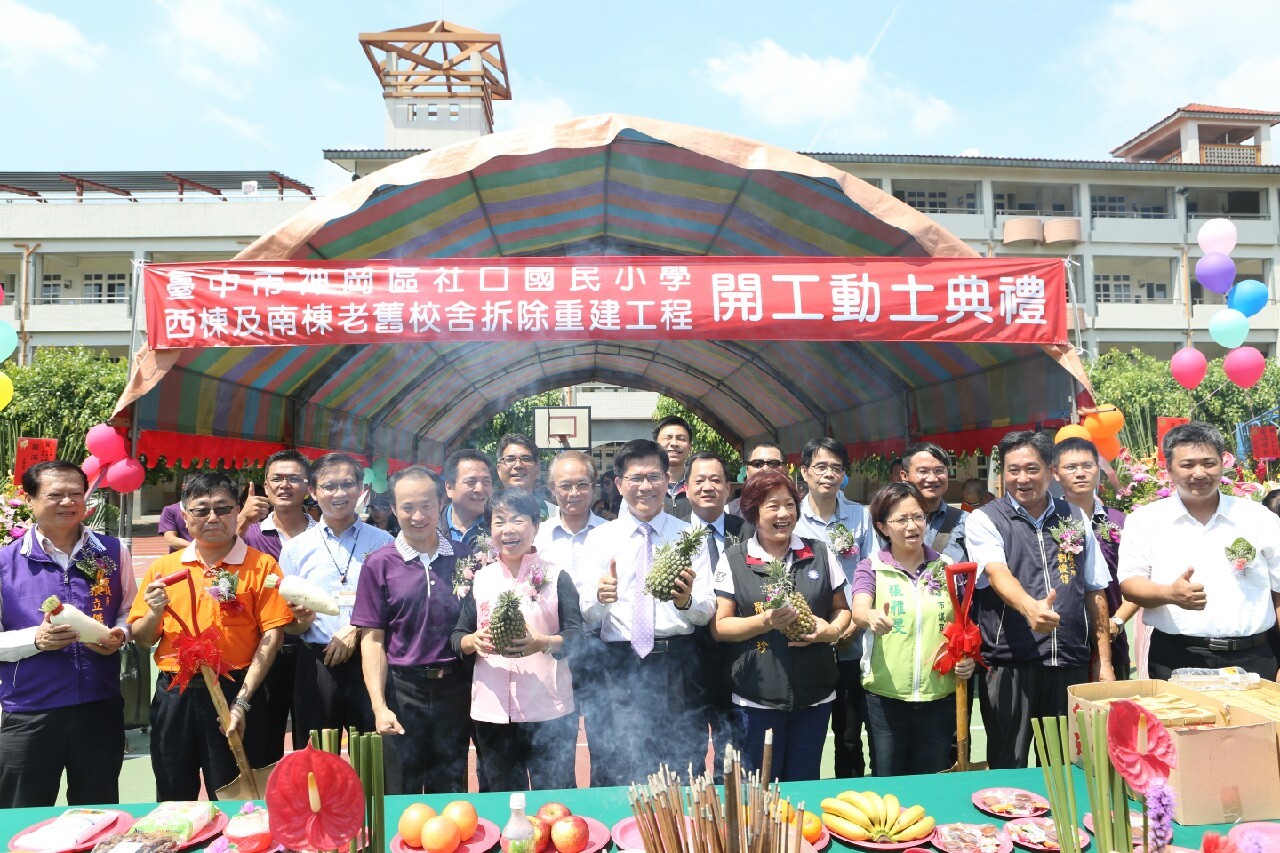 台中市神岡區社口國小於今(19)日舉行西棟南棟老舊校舍拆除重建工程動土典禮,由市長林佳龍、學校師生及各界人士一起見證祈福。林市長表示,市府重視城鄉均衡發展,除編列固定預算逐年補助學校整建補強,也積極向中央爭取經費挹注。社口國小校舍重建即是中央地方合力補助的典範,工程完成後,該校學生將享受更優質的教育資源。