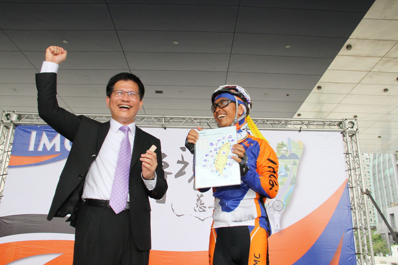 「為環台鐵騎勇士喝采!」林市長表示,企業團體以自行車環台方式送善款給學校,資助清寒學生,直接接觸大自然、人民與土地,大家滿載而歸,大家從台中出發又回到這裡是最正確的選擇,市府開始規劃一連串的「OK台灣」活動,O有零的意思,K則是kilometer里程數,代表台中做為台灣地圖測量的座標原點。