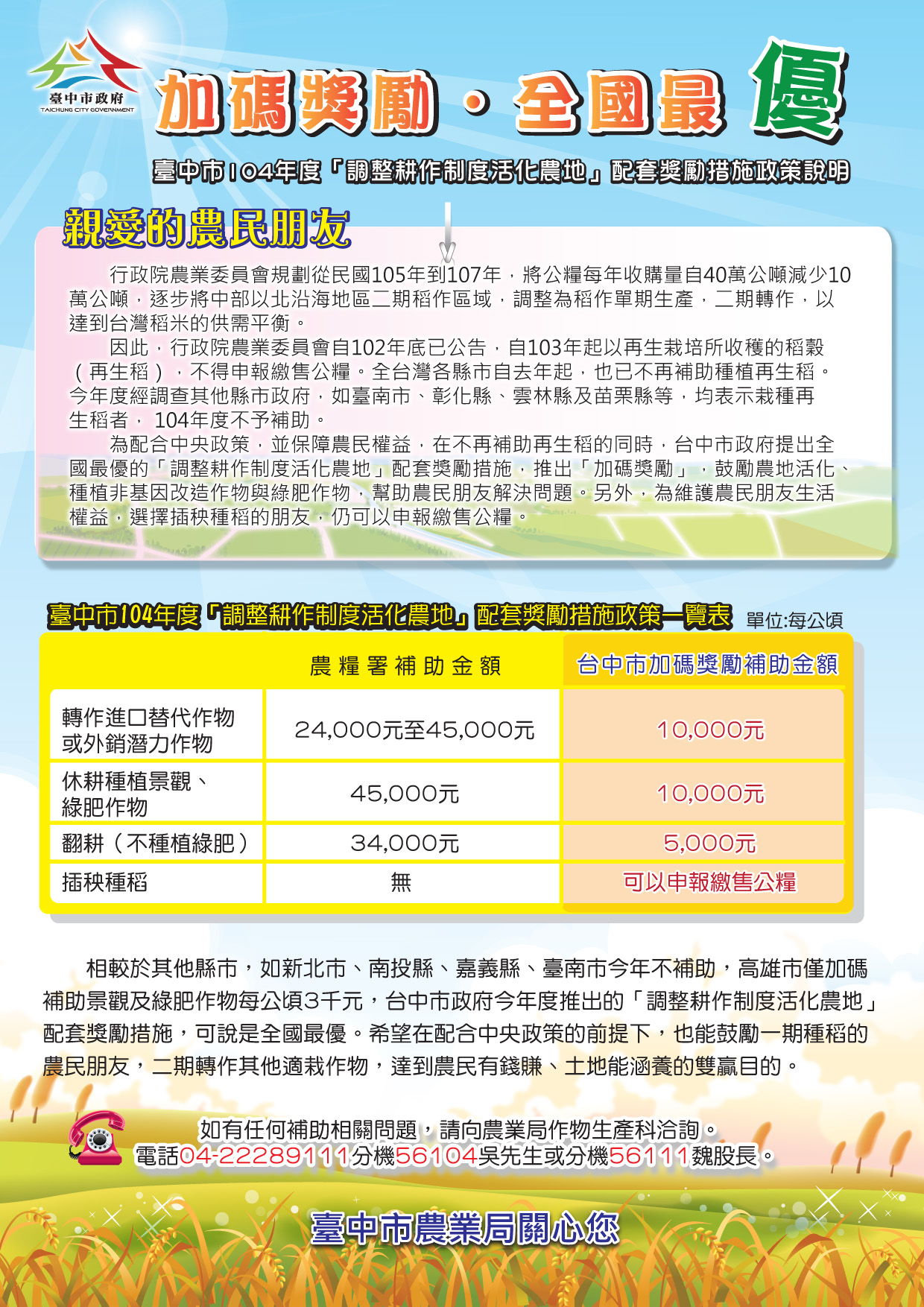 農業局也將製發文宣由各區公所轉知農民這項好消息;民眾如有任何補助相關問題,請向農業局作物生產科洽詢,電話04-22289111分機56104吳先生或分機56111魏小姐。