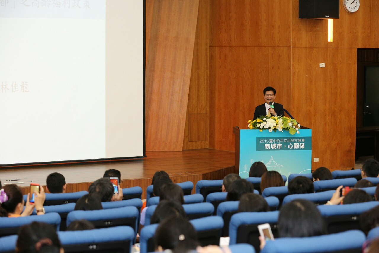 2015臺中怡居宜居城市論壇吸引超過330位民眾踴躍參加,林市長以「移居城市、生活首都」高齡福利政策專題演講。他分享為什麼愛上台中的原因,因為台中市是一個充滿陽光活力的健康城市,來住的人就會被它吸引,當年他與太太想找一個可以安身立命、成家立業的地方,2個小孩都還沒上小學,大人的選擇會影響下一代,因此他相當慎重選擇發展的地方。