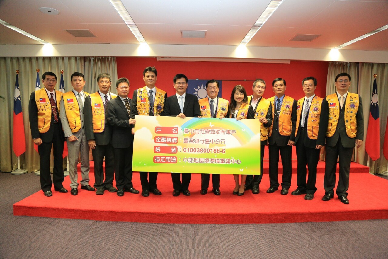 國際獅子會300-C1區(忠明獅子會)2011-2012會長聯誼會,響應市府成立中部地區燒燙傷重建中心計畫,今日由會長吳素芬為代表,捐贈50萬元到社會局專戶,並由林市長在市政會議上代表受贈,林市長也頒發感謝狀,感謝他們的善心。林市長也宣布,目前專戶已募得約1,000萬元。