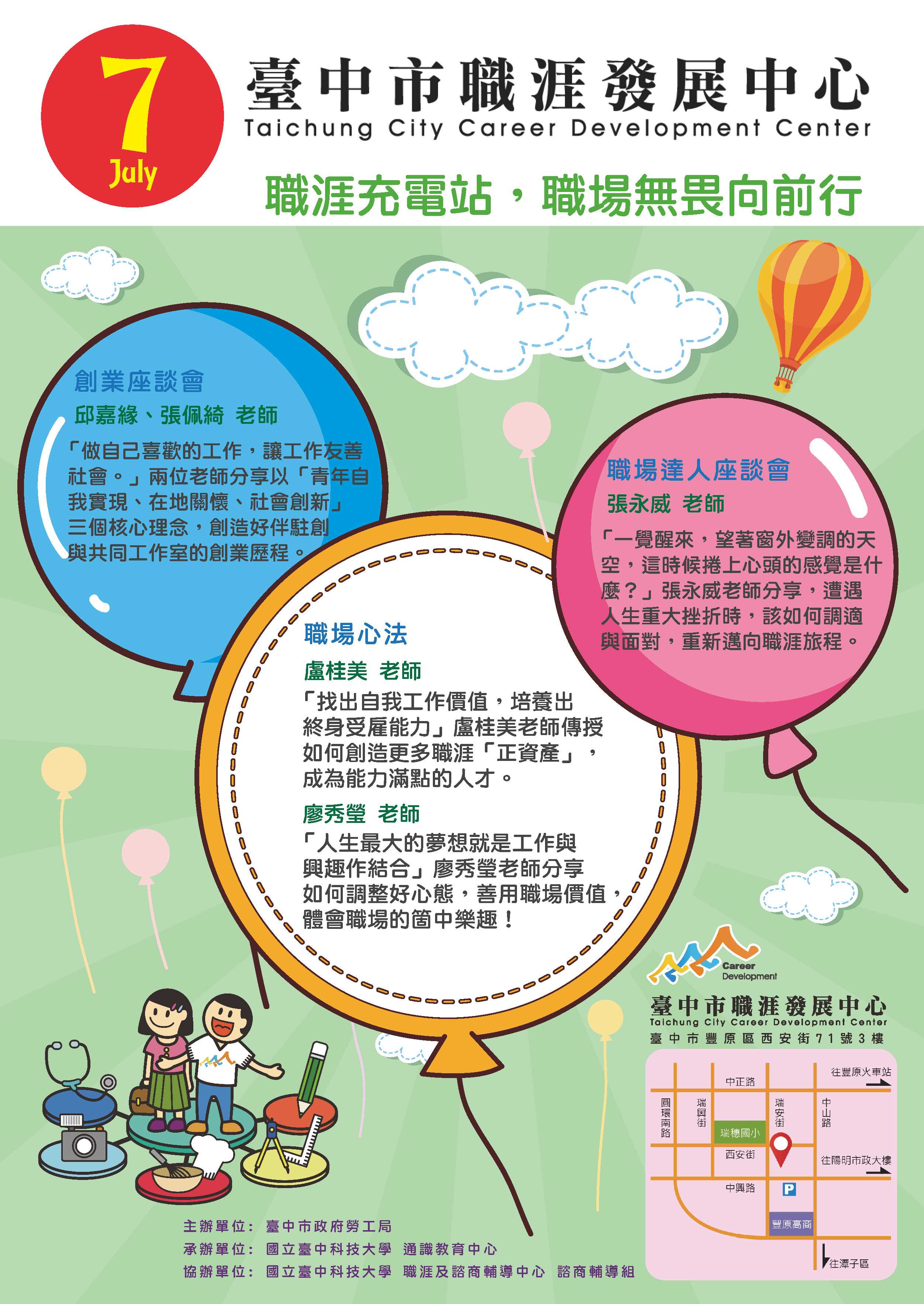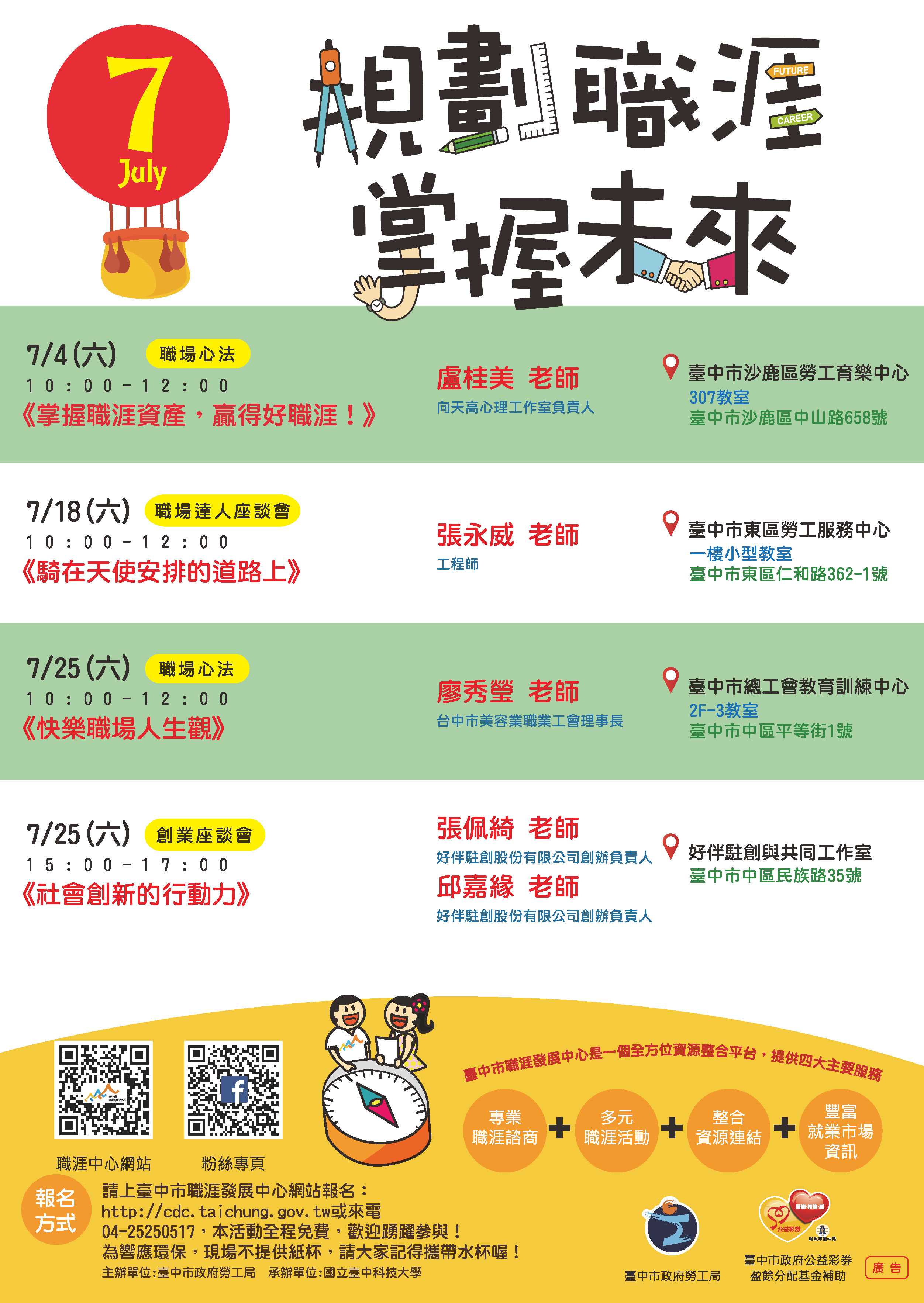 勞工局表示,希望一系列活動能帶著民眾提升職涯規劃能力,歡迎踴躍報名參加,詳細活動訊息請上職涯發展中心網站(http://cdc.taichung.gov.tw/)或粉絲專頁(https://www.facebook.com/TaichungCDC)查詢,服務專線:04-25250517。(7/14*7)