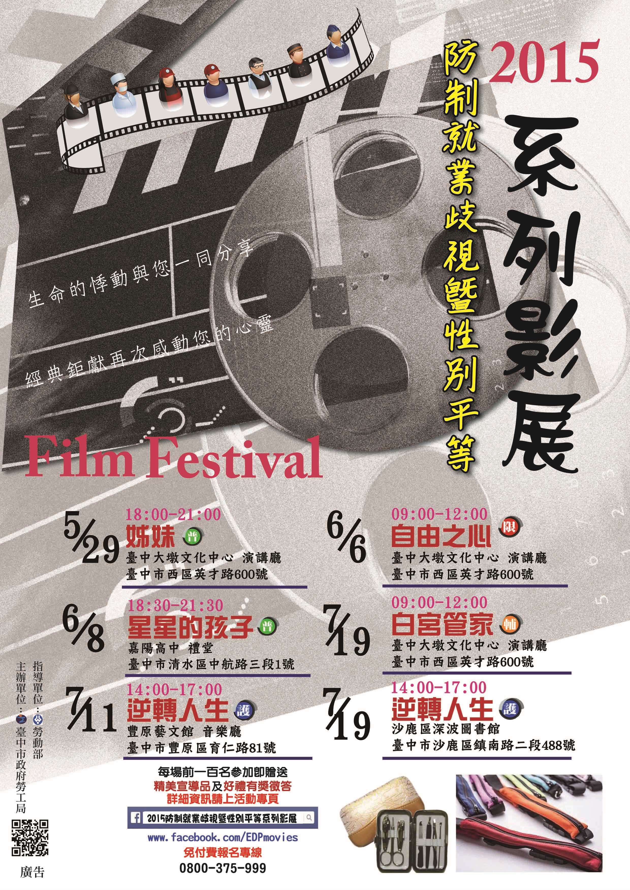 防制就業歧視暨性別平等系列影展均免費入場,活動最後還舉辦有獎徵答,系列影展相關資訊及預約報名請上活動網站https://www.facebook.com/EDPmovies,或電洽免付費專線0800-375999報名,歡迎民眾踴躍報名參加。(7/16*3)