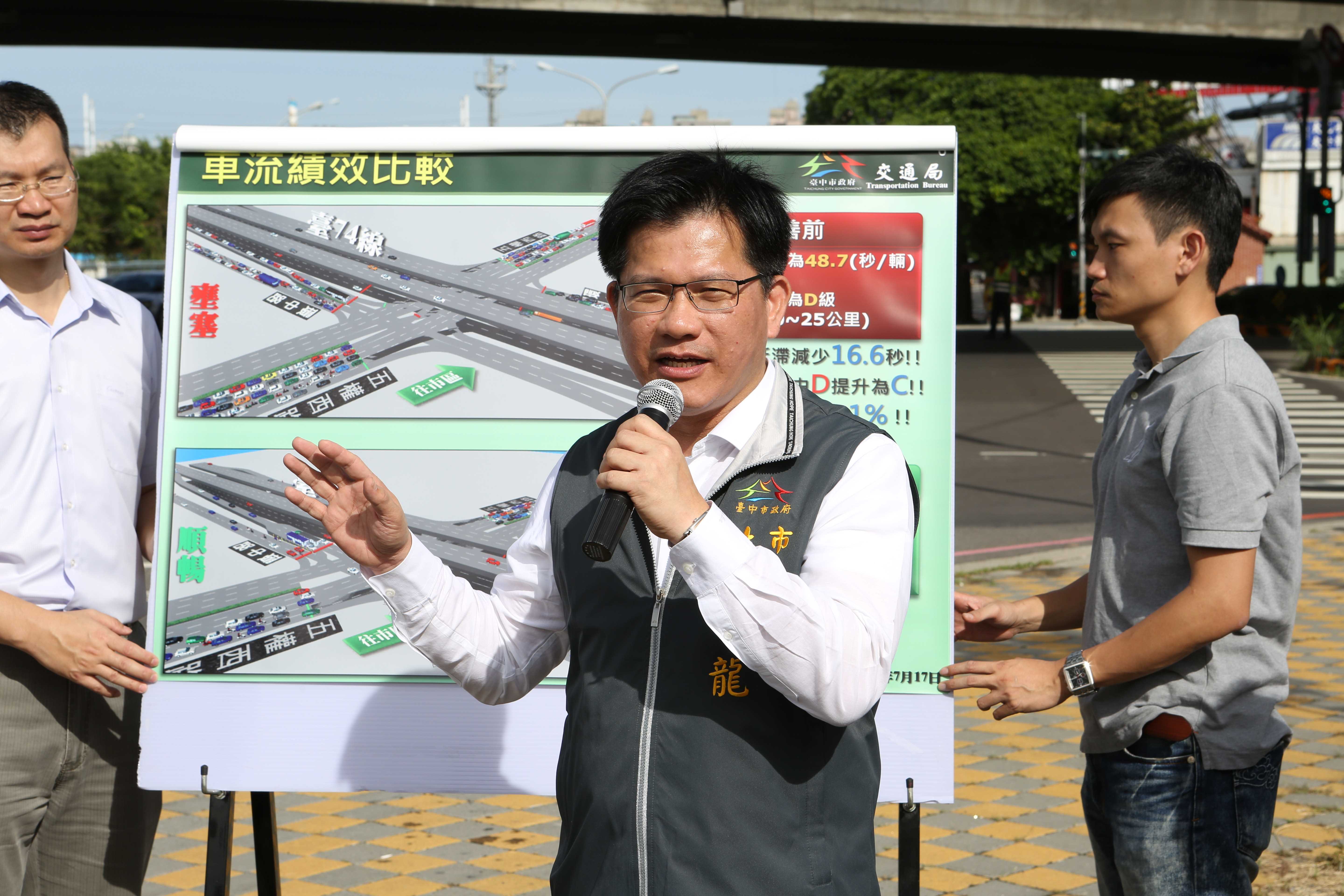 林市長表示,環中路與五權西路口是高速公路及快速道路的交叉點,過去交通非常壅塞,有「魔鬼路口」的稱號,市府透過交通管理手段,改善標線與號誌後,目前平均每輛車在尖峰時段通過該路口的時間(含紅綠燈停等)已由先前的48.7秒改善為32.1秒,改善績效達34.1%,且該處的肇事率與取締率均顯著下降,交通改善成效良好。