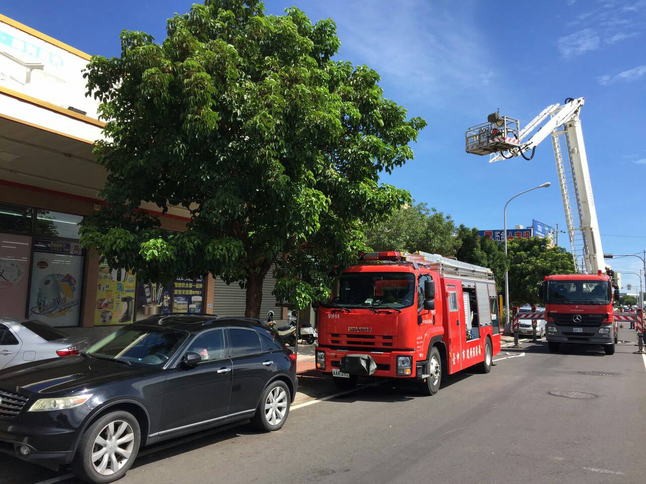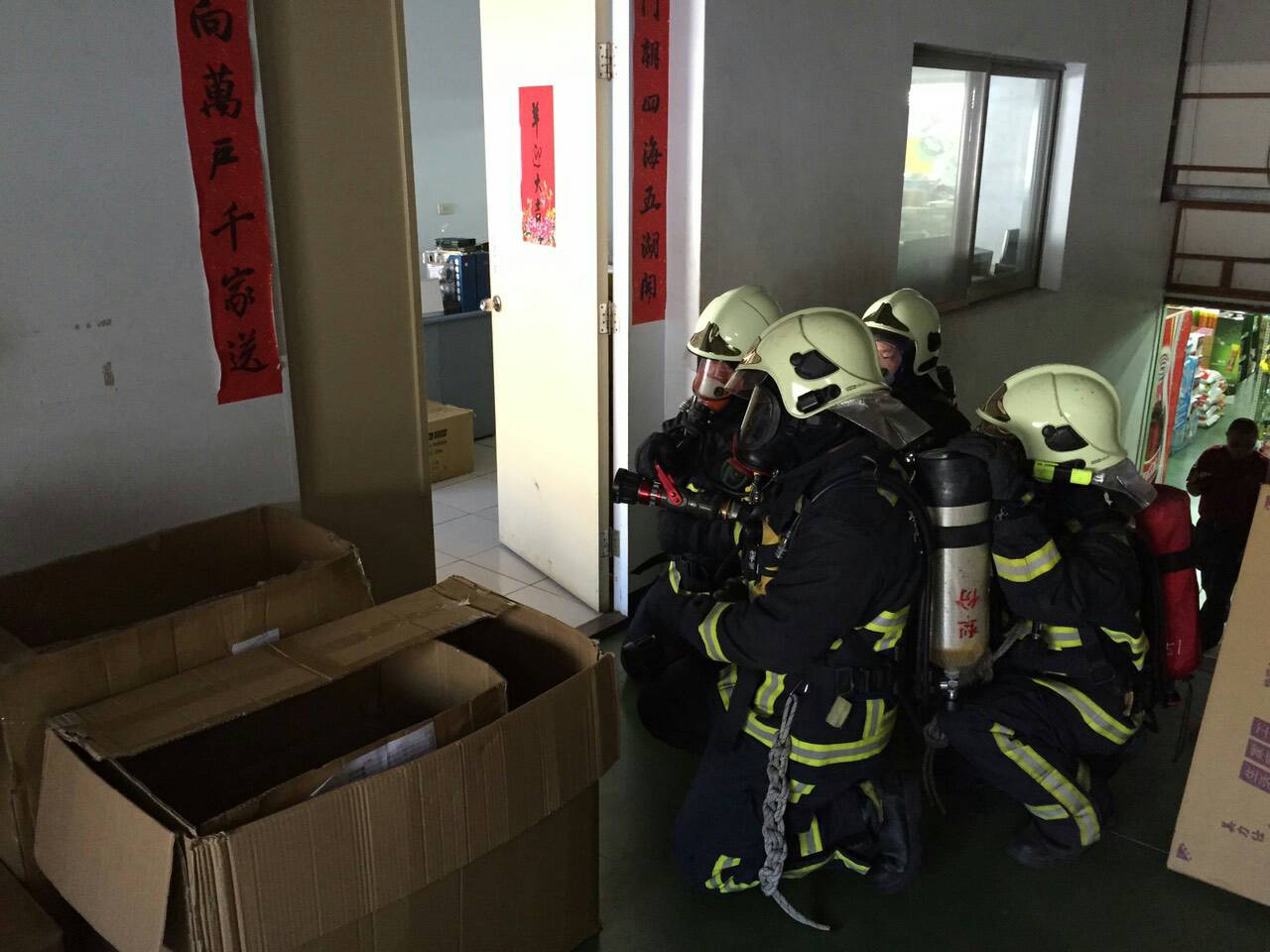 為此,消防局持續加強對鐵皮屋構造的超級市場進行搶救演練,今天在大肚區的演練,包含消防車輛的部署、抵達現場的處置作為、救災人員的安全管制、消防人員的佈線搶救、消防水源的掌握、人命救助及搜索、雲梯車升梯操作防護作業、安全回報機制、救出傷患的處置、消防人員受困的求救及救援、閃(爆)燃的緊急撤離作業、人員的裝備清點等,過程逼真、嚴謹。
