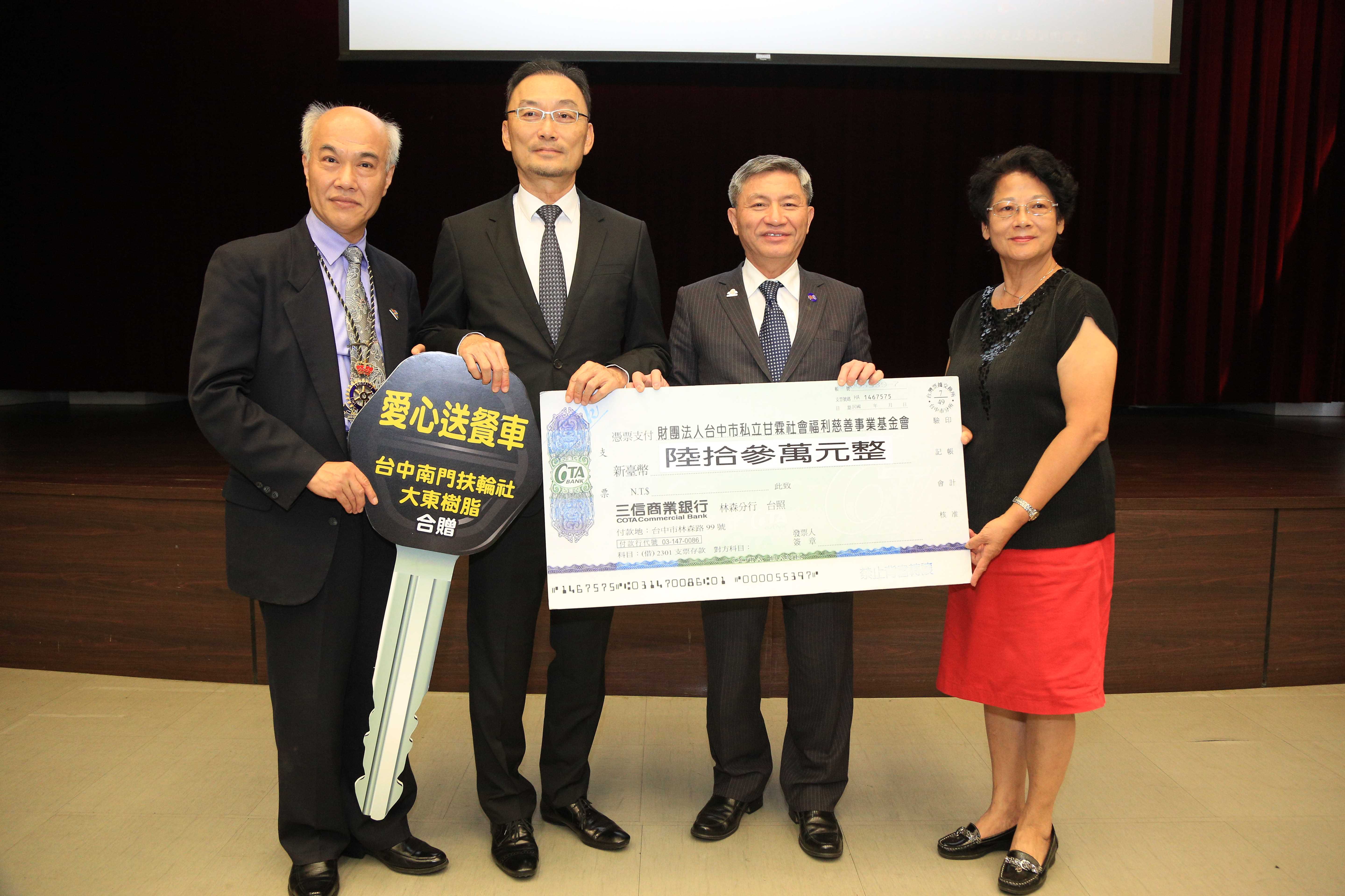 台中市南門扶輪社長期關心弱勢老人用餐需求,與大東樹脂化學股份有限公司共同捐贈一輛送餐車給甘霖基金會,今(21)日於台中市政府新市政大樓舉行「愛心餐車」捐贈記者會,由南門扶輪社長黃吉隆、大東樹脂董事長廖光亮共同代表啟動捐贈儀式,張副市長、社會局副局長陳仲良也到場見證。