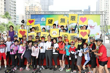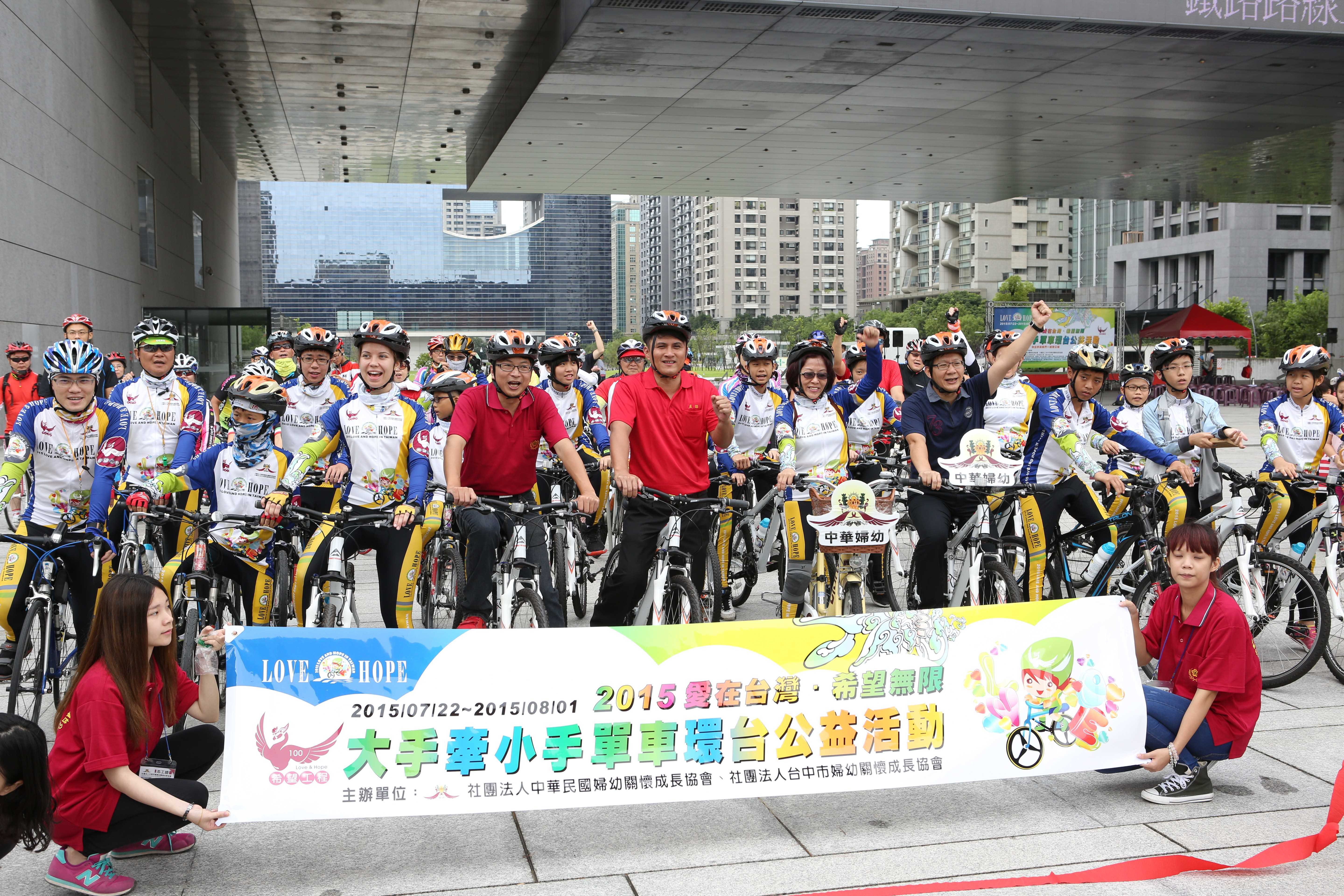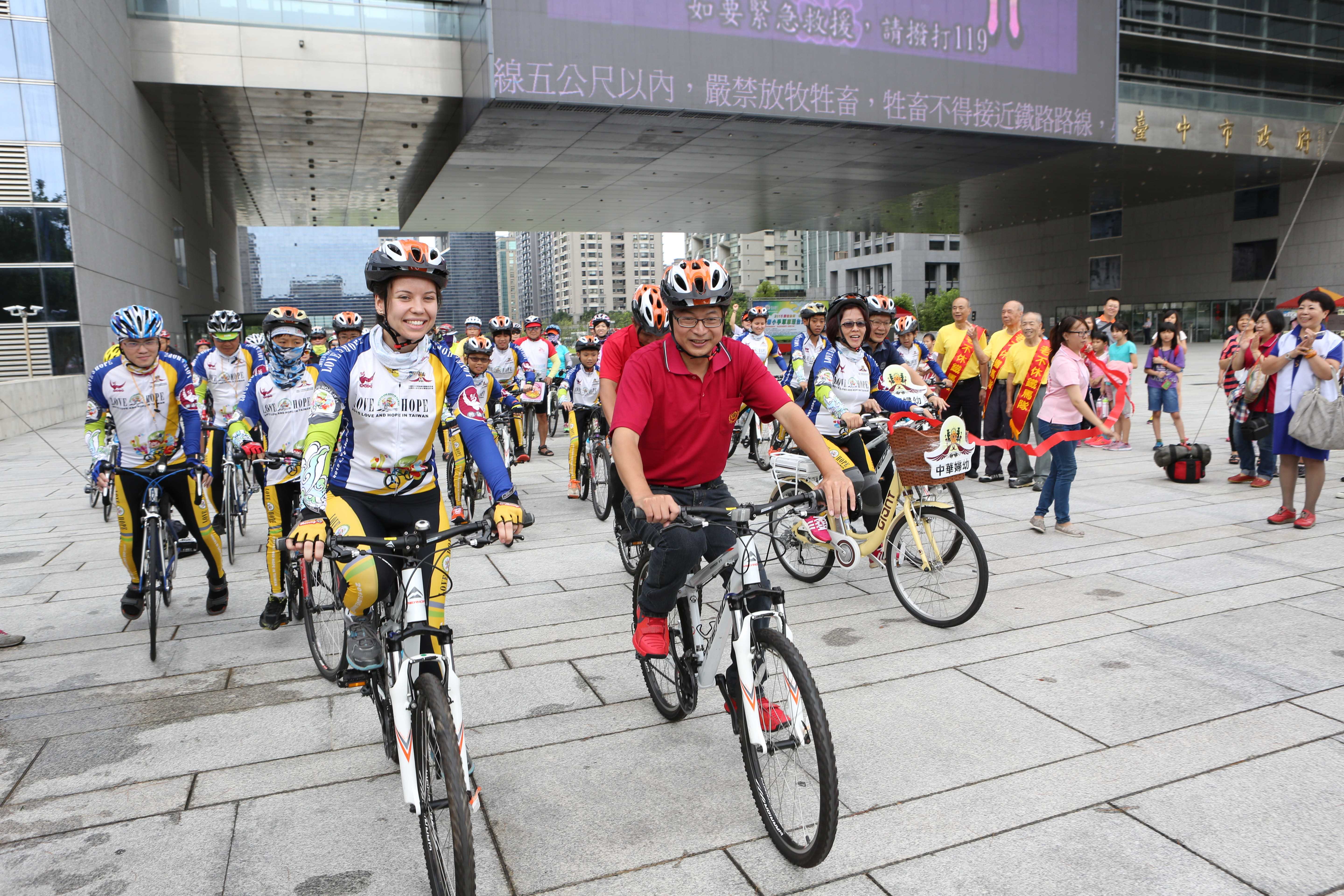 數百名志工及數十家企業參與今年「愛在台灣‧希望無限」大手牽小手單車環台公益活動,林市長及市議員張廖萬堅等人今日出席啟航儀式表達祝福。林市長表示,感謝婦幼關懷成長協會以及許多企業界的支持,舉辦這次單車環島活動,讓小朋友有機會走出去,接觸美麗的台灣,過程中還能回饋社會,雖然會遇到風雨,但大家朝著一致的目標前進,逆風時踩穩腳步前進,體驗生命各種的起伏和挑戰,最後一定會雨過天晴。