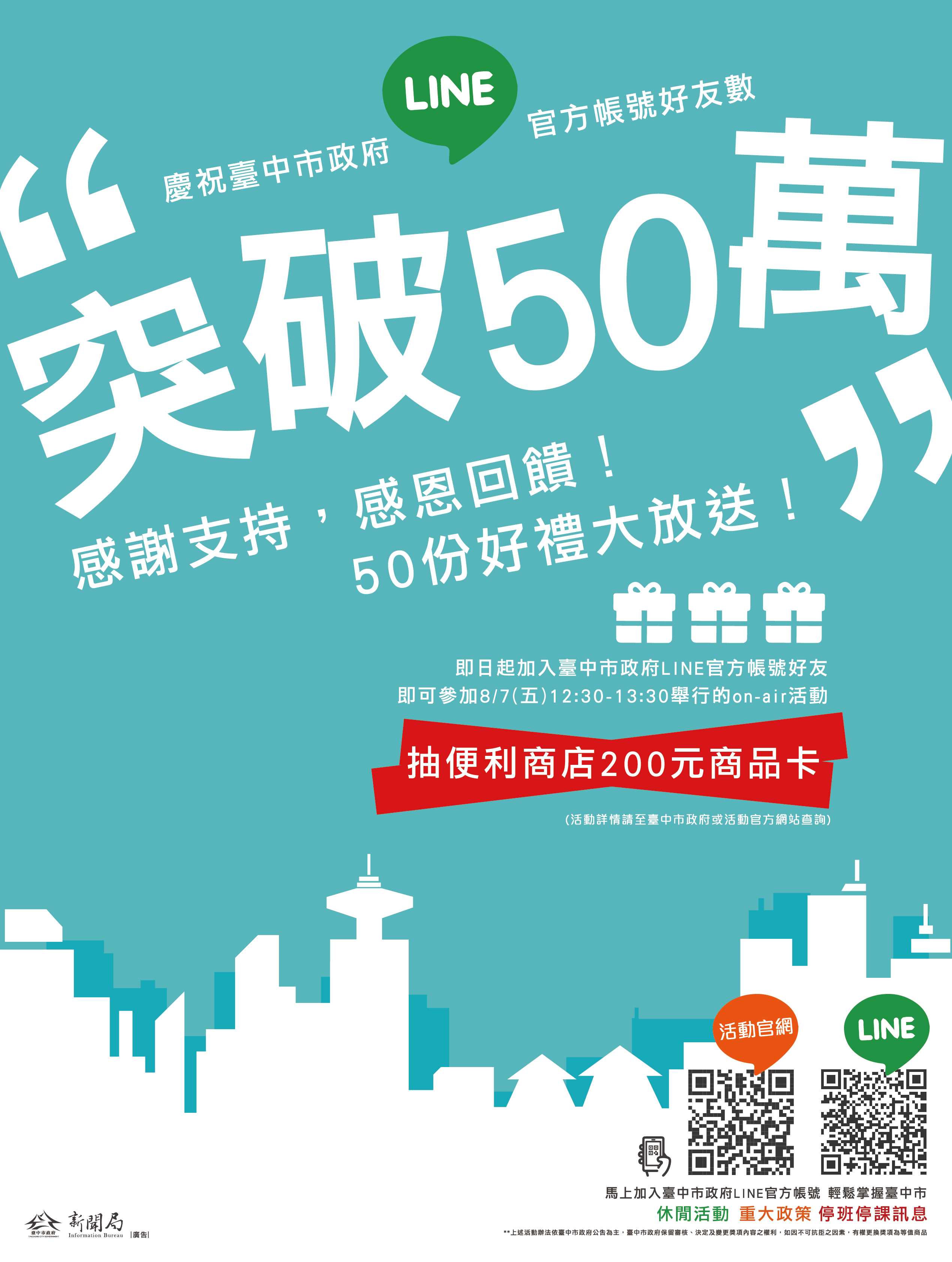 新聞局長卓冠廷表示,臺中市政府LINE官方帳號自102年7月成立至今正好滿2年,好友數已衝破50萬人,為感謝民眾熱情支持,特別舉辦慶祝活動,提供50份好禮回饋,參加的民眾都有機會抽中便利商店200元商品卡,實用又方便!