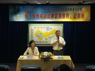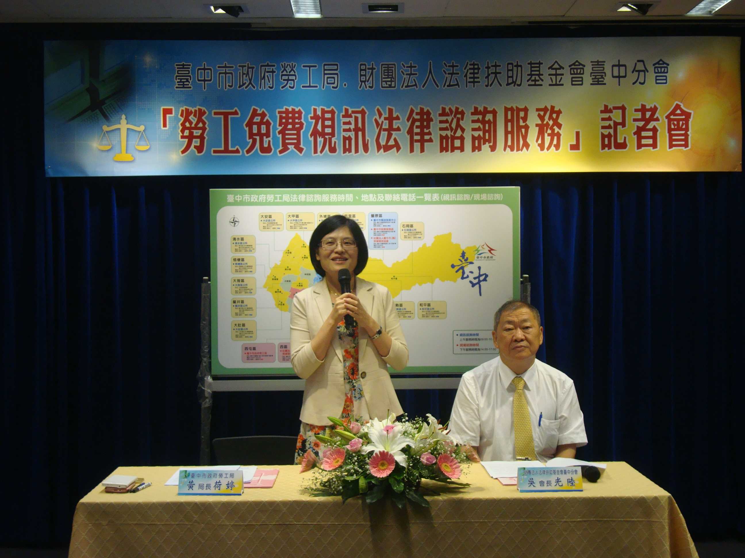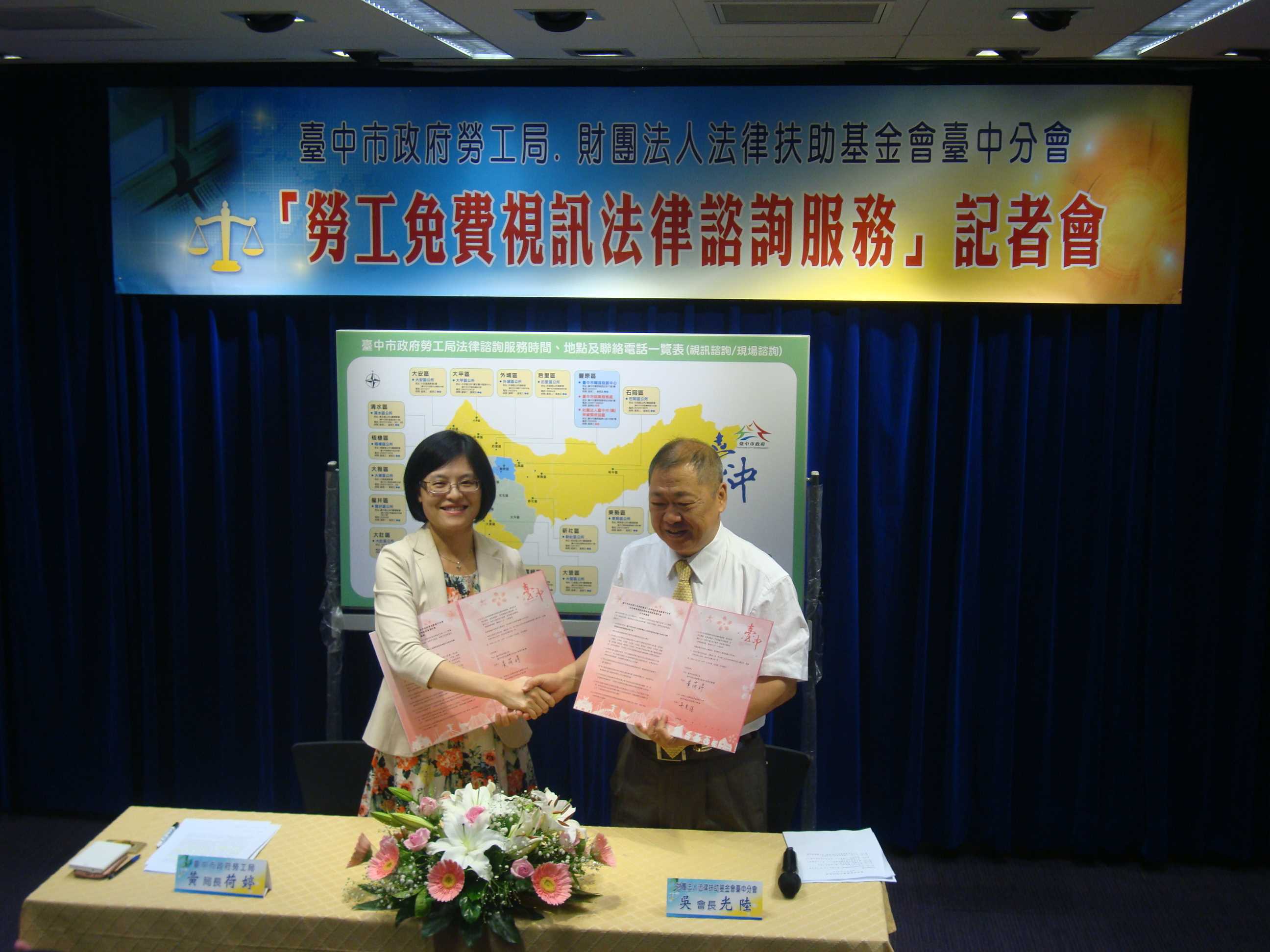 勞工局長黃荷婷與法律扶助基金會台中分會長吳光陸今日在台灣大道市政大樓舉辦簽約記者會,黃局長表示,市府原已在台灣大道市政大樓4樓勞工局、豐原區陽明市政大樓提供現場法律諮詢服務,並委託台中市勞雇關係協會、台中市勞資關係協會與臺中市(縣)勞資關係協會提供免費律師駐點諮詢;今年以多元方式,提供完整的勞資爭議律師諮詢服務措施,使偏遠地區勞工朋友如遇到法律疑難時,可利用區公所網路視訊進行法律諮詢,節省車程時間。