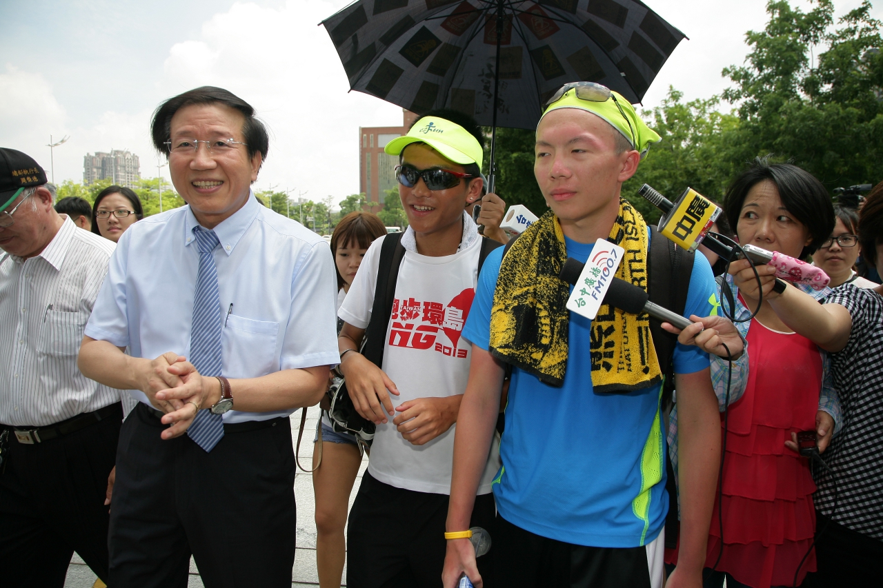 台北市育成高中學生許冠澤和南港高工學生周子翔自主規劃「25天徒步環島反黑箱課綱行動」,今天走到台中市,也是行程中的第五站。市府教育局長顏慶祥不僅給予支持,一見到兩位同學,更讚賞他們以溫和、理性的方式,正在做讓台灣變得更美好、更進步的事情。