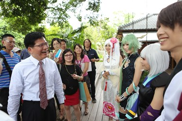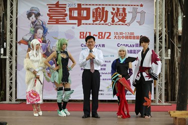 市長林佳龍今天在文化局長王志誠的陪同下,一起為「2015台中動‧漫‧力」進行宣傳。林市長肯定今年活動與本土結合,稱讚這些cosplay是城市行銷的最佳代言人,無論在台灣文學館、台中文學公園、放送局、州廳、演武場、刑務所甚至是舊酒廠的文創園區,都能看到cosplay,讓在地人與觀光客感受到台中市創新、活潑與有活力的樣貌,也期待cosplay作為台中觀光文化推廣的代言人。