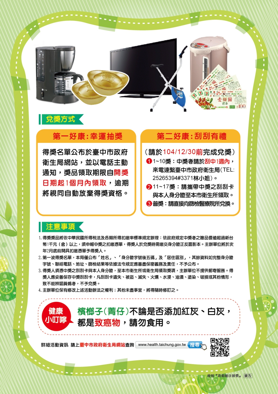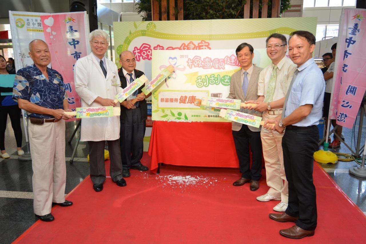 市府衛生局今(30)日在台中醫院舉行「檢查顧健康,刮刮送好康」活動記者會,由衛生局主秘張瑞麟、台中醫院副院長黃元德、診所協會理事長鄭煒達、醫師公會秘書長林恒立、抗癌天使林炎,共同宣導免費四癌篩檢,不僅能為自己健康把關,還有機會刮中大獎。