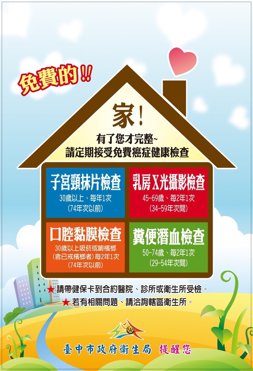衛生局指出,子宮頸癌、乳癌、大腸癌與口腔癌約佔所有癌症發生人數的三分之一,推動四癌篩檢,可以有效地降低癌症發生率或死亡率;其中,抹片檢查可有效降低子宮頸癌發生率、死亡率達60%;乳房攝影可降低30%乳癌死亡率;糞便潛血檢查可降低大腸癌死亡率20%至30%;口腔黏膜檢查可降低43%口腔癌死亡率。(7/30*13)