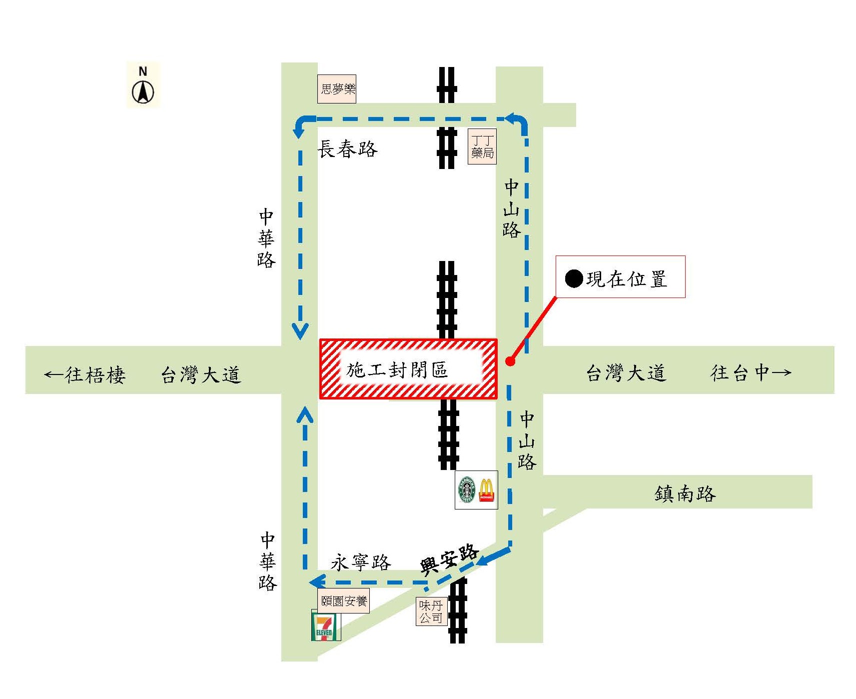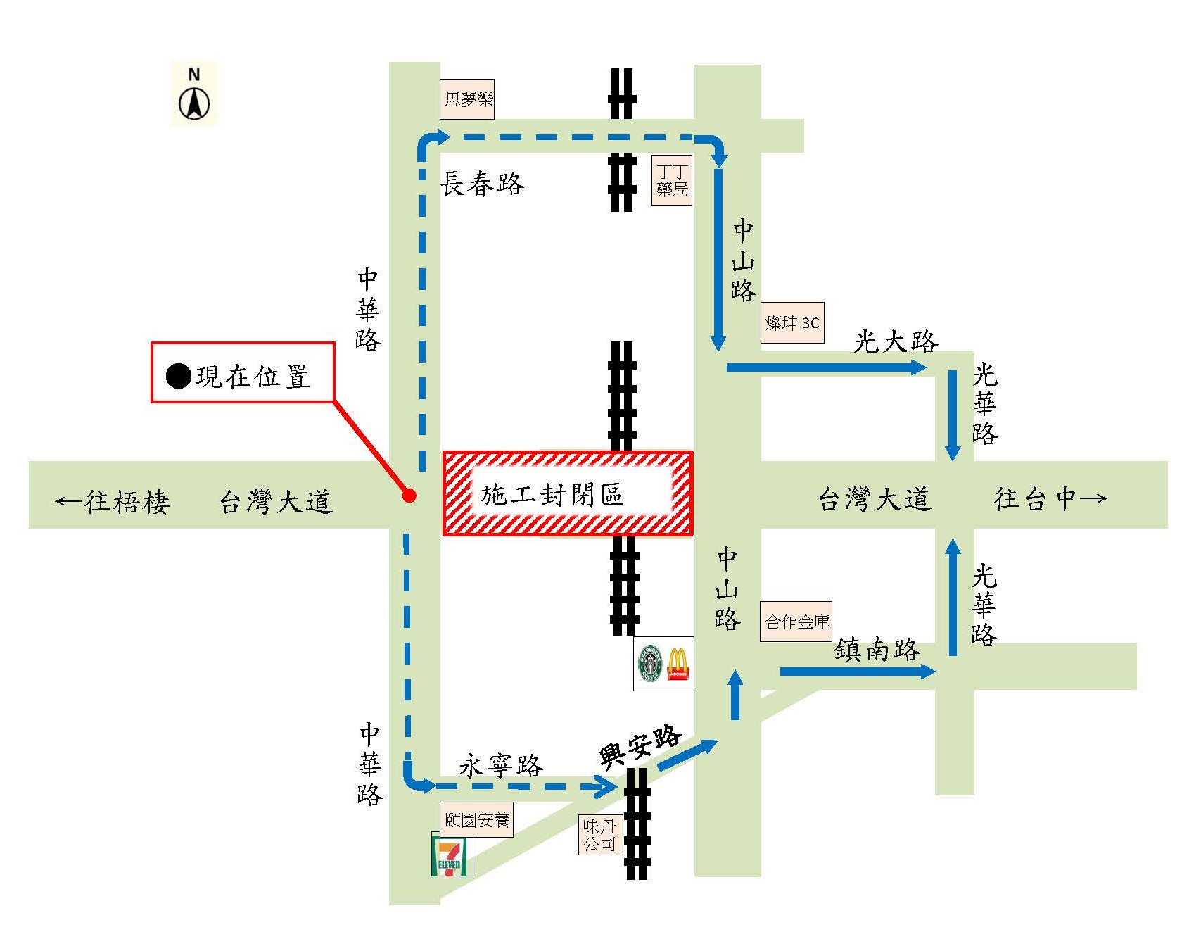建設局建議,用路人於封閉期間可行駛西行或東行替代道路,西行替代道路往梧棲方向可由中山路、長春路、中華路通往台灣大道;或行駛中山路、興安路、永寧路、中華路往台灣大道通行。
