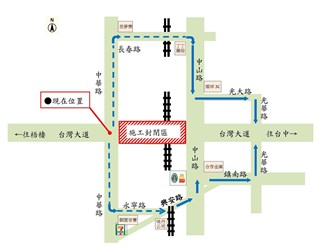 東行替代道路往台中方向可由中華路、長春路、中山路通行台灣大道;或行駛中華路、永寧路、興安路、中山路往台灣大道一路通行。(7/31*7)