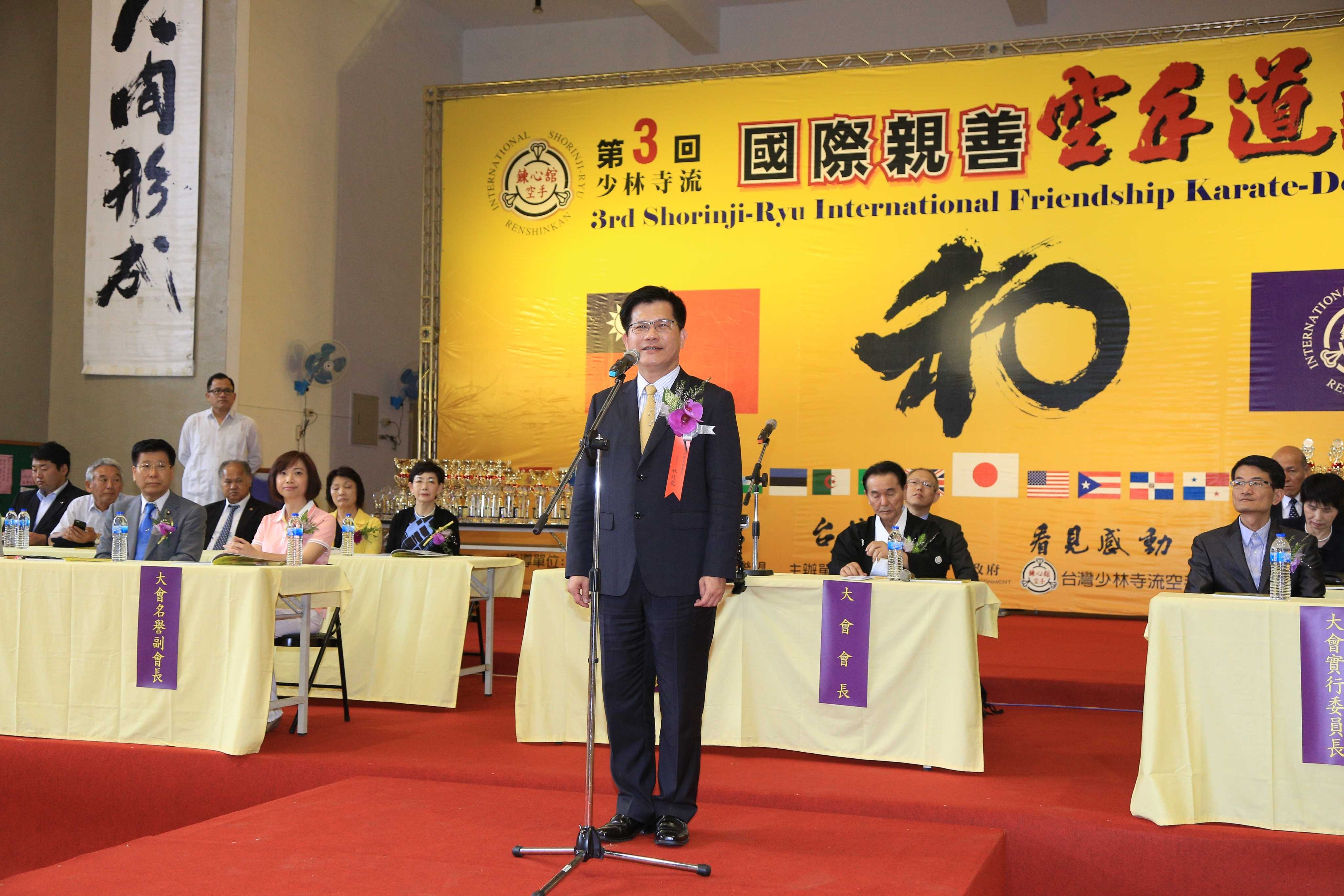 林市長也說,今年大會首次移師海外選在台中,感謝國際少林寺流空手道聯盟總會長保巖、台灣少林寺流空手道協會理事長蔡尚諭、鍊心舘台灣總部長黃啟昇,以及立法委員何欣純、市議員李天生等人的大力促成,他身為主辦市長也與有榮焉。