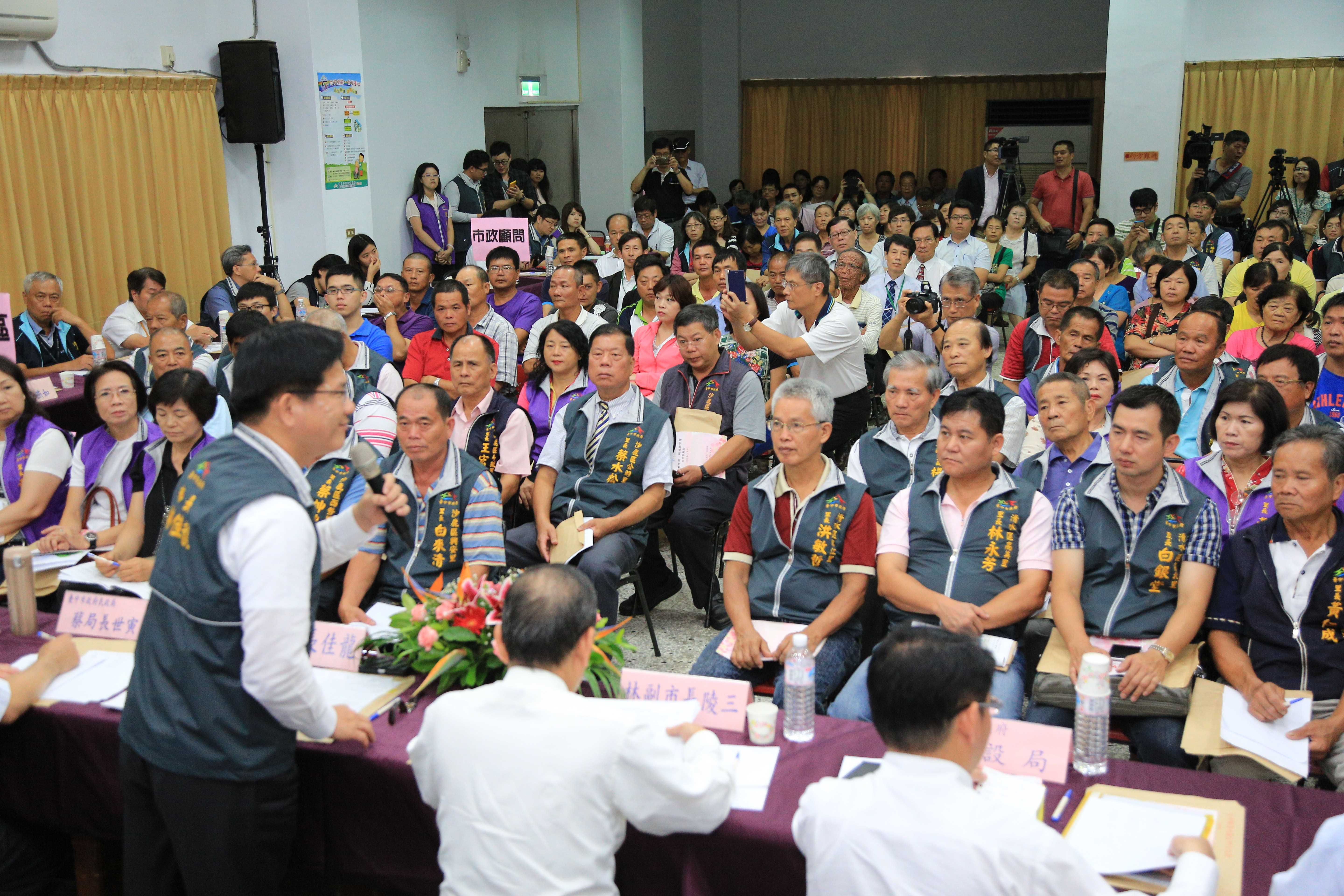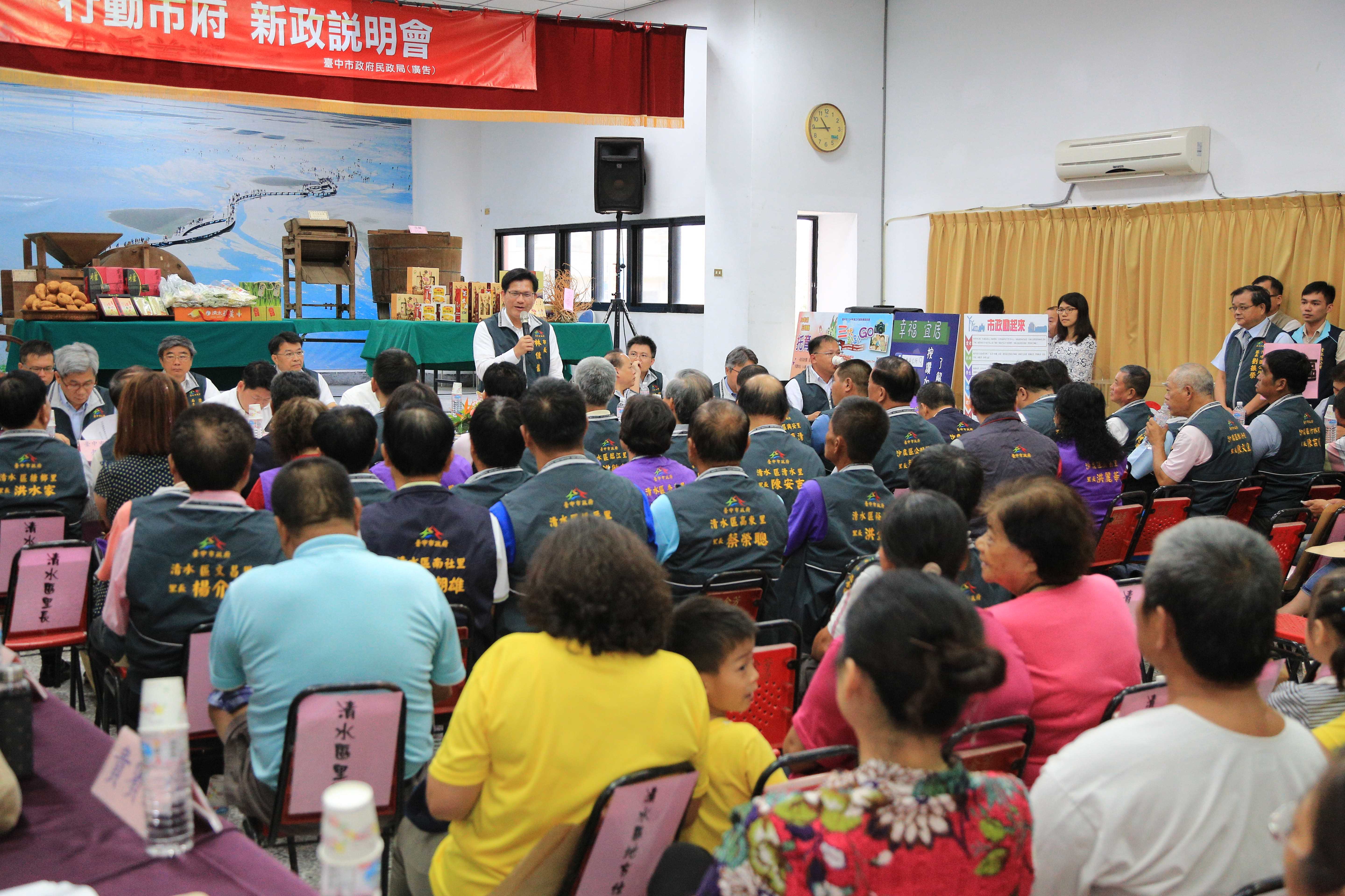 「走入基層,下鄉傾聽」台中市政府舉辦新政說明會第一場從清水區開跑,邀請清水區、梧棲區、沙鹿區的市議員楊典忠、尤碧鈴、王立任、顏莉敏及各里長與市政顧問們參與,林市長親自說明民眾所重視的各項政策,並說明未來的大台中山手線、智慧公路網「三環三連」、港市合作等政策願景,希望讓地方更瞭解市府施政方向,並聽取居民意見。