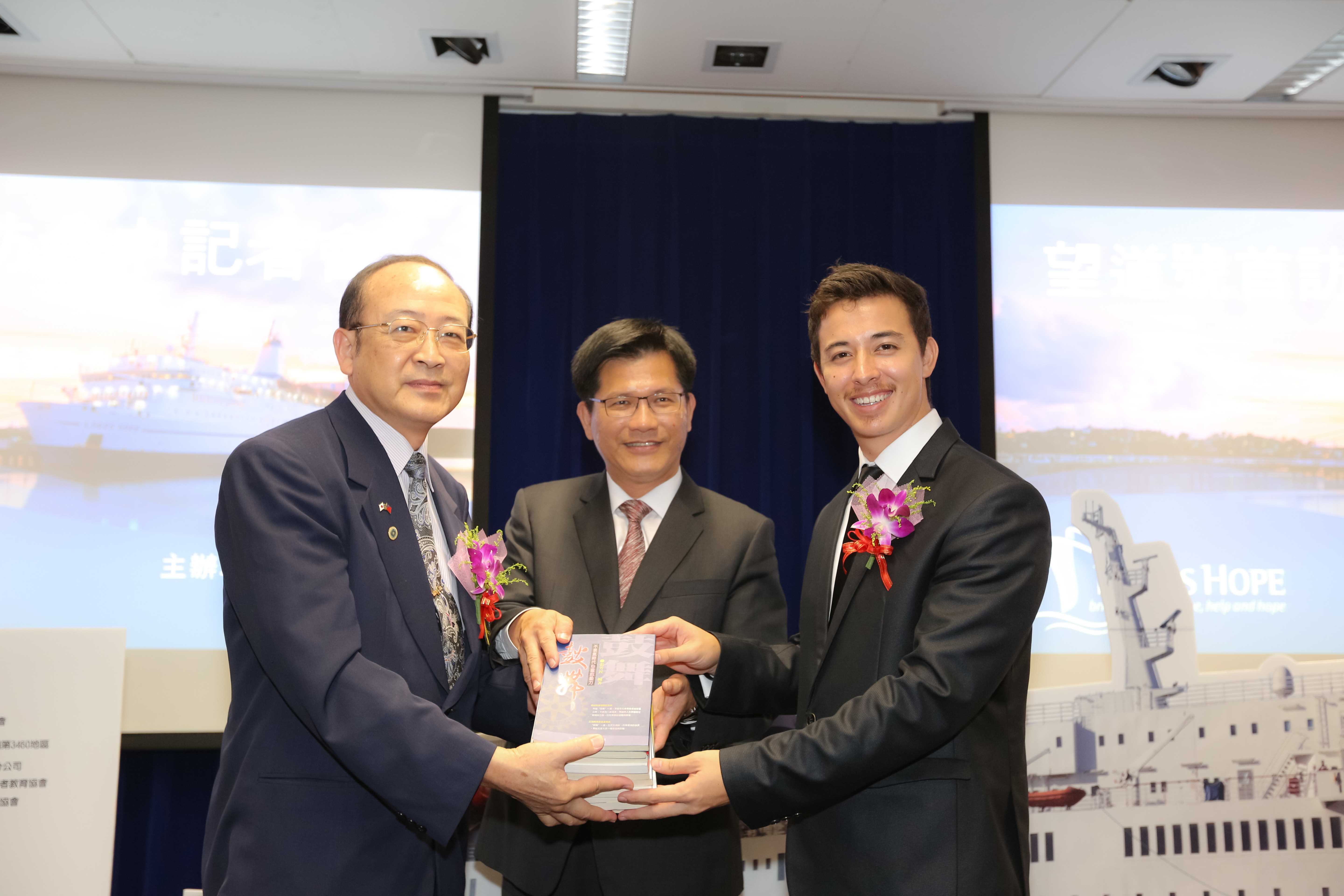 今天記者會現場,林市長也送出「佳龍帶你遊台中」及「城市行動派」兩本著作給望道號,希望書籍一起上船,跟隨望道號走向世界。而立委黃國書、市議員黃馨慧、國際扶輪社台中第3460地區總監邱世文及望道號籌委會主委莊信德牧師等人也到場共襄盛舉。