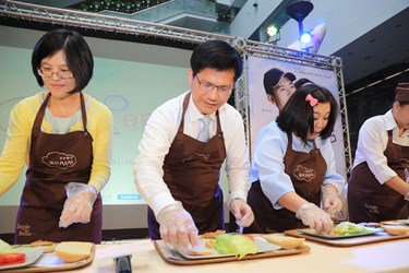 由市府勞工局籌畫拍攝的104年身心障礙產品行銷推廣計畫微電影「Coco的三明治」,今(6)日正式在台中市政府公開播映,林市長在勞工局長黃荷婷的陪同下出席首映會,劇中女主角鍾欣凌及男主角曾少宗也到場亮相;林市長並與來賓一同動手製做「Coco三明治」,體驗微電影中的場景,現場溫馨,笑聲不斷。