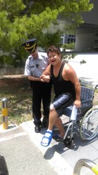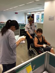 台中市警察除維護治安外,對關懷民眾的貼心服務也不遺餘力。日前保安大隊警員林哲弘執行勤務時,發現新市政大樓文心樓北側停車場有一男子步履蹣跚、行動困難,他仔細察看,發現男子左腳踝打石膏,疑似骨折,林哲弘立即請其他同仁向聯合服務中心借來輪椅,並推著輪椅帶這位男子到相關單位洽公,熱心行為也被其他民眾稱讚,說他真是有愛心的「輪椅哥」!經林哲弘詢問,該名男子姓王,之前騎機車因交通事故導致手腳骨折及全身多處擦傷,後來想到市府洽公,卻因傷勢造成行動不便、氣喘噓噓,只能沿路休息,所幸遇到林哲弘協助商借輪椅,才順利完成洽公。沿途中民眾見到林哲弘的義舉,都紛紛豎起大姆指稱讚,說他是「輪椅哥」!林哲弘靦腆地表示,這只是舉手之勞,為民服務本來就是警察應該做的。(8/6*7) 聯絡人:台中市政府警察局保安大隊林先生 聯絡電話:04-22518983
