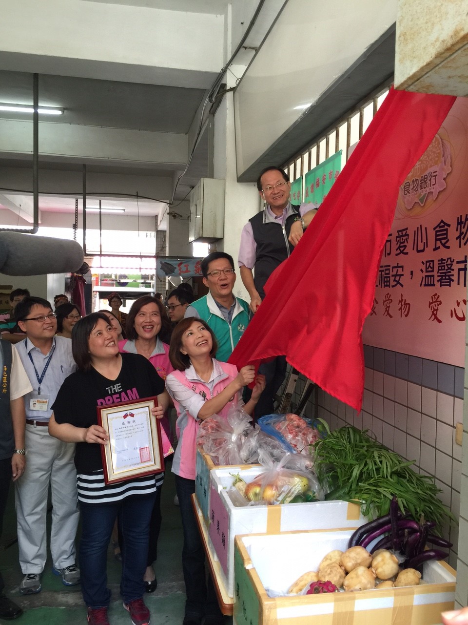 市府社會局及經發局今(11)日在福安公有市場舉行「愛心食材交流平台」揭牌儀式,何明社區發展協會為了感謝福安公有市場攤商熱情響應,特地將攤商日常捐贈物品情形及社區老人用餐情形拍照後製作成感謝海報,回贈福安公有市場,感謝市場的愛心。