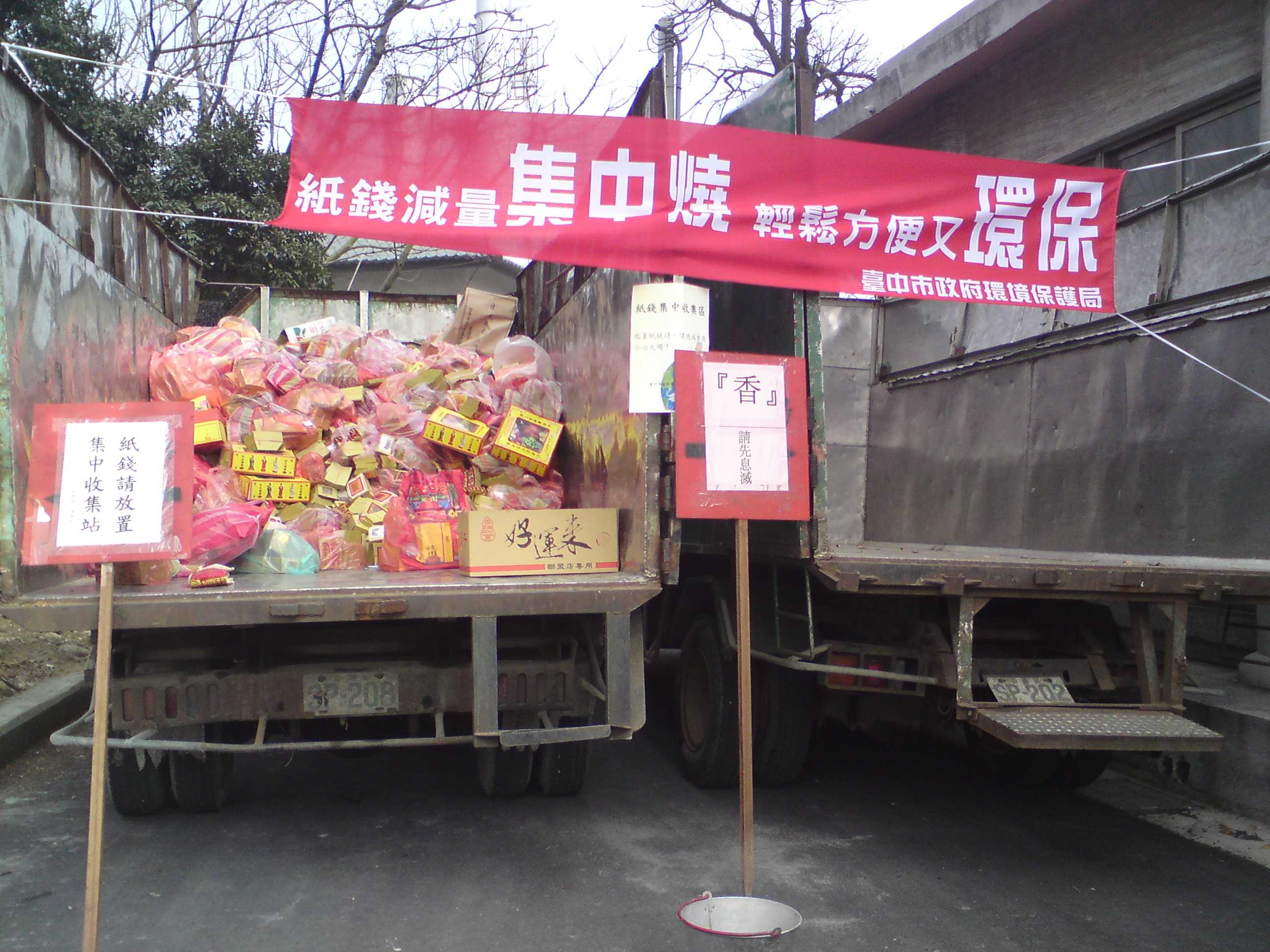 為加強推動紙錢集中燃燒作業,中市各區清潔隊均可受理紙錢集中預約清運服務,無論是寺廟、公墓、納骨塔、社區大樓及機關團體,如有紙錢集中清運需求,均可聯繫各區清潔隊,並留下相關資料及單位聯絡方式,各區清潔隊將調派人員及車輛進行清運,以減輕中元節大量燃燒紙錢所造成的空氣污染。