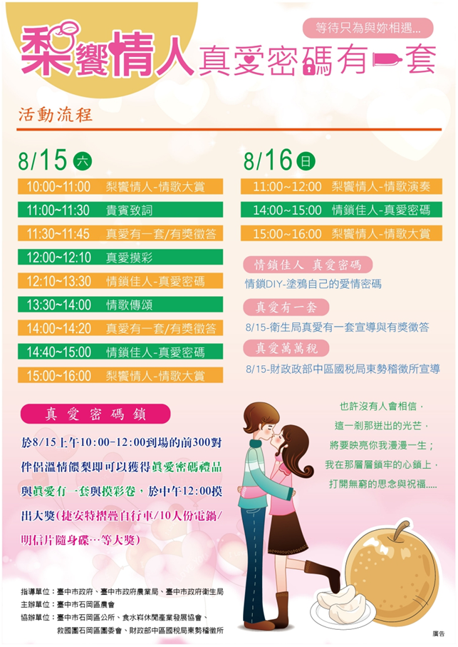 另外也安排樂團演奏情歌、「真愛有一套」有獎徵答活動、農特產品展售、好梨品嚐等活動,讓民眾享受悠閒情人佳節,感受愛情的甜蜜滋味。(8/14*13)