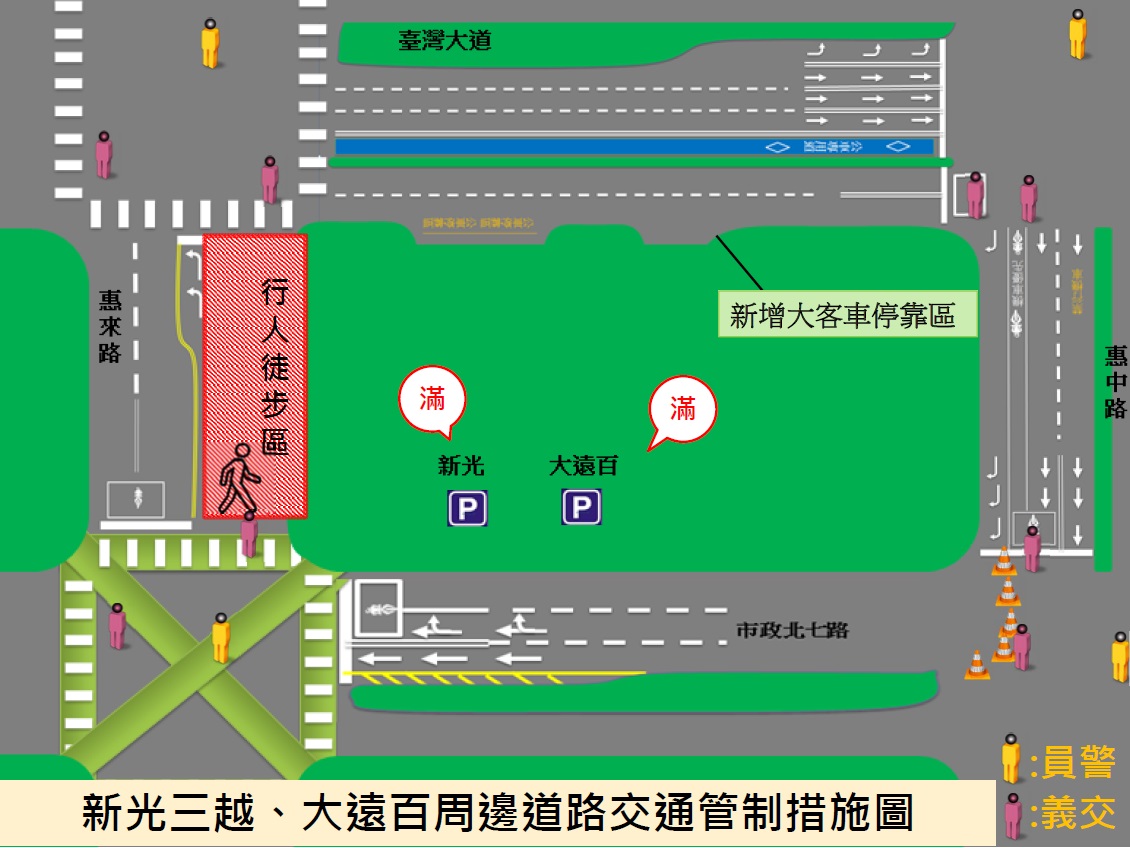 此外,台灣大道大遠百前避車彎改設大客車停靠區,分流新光三越前公車亭的遊覽車;而台灣大道、惠中路、市政北七路、惠來路等四路口,各派一名員警及增派兩名義交,協助疏導及實施交通管制。