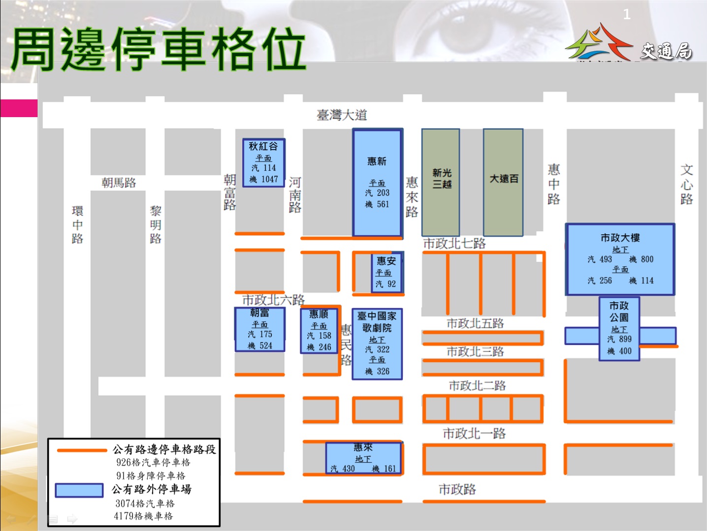 台灣大道新光三越及大遠百路段,長久存在交通壅塞問題,台中市政府交通局將自8月22日起,每逢假日中午12時至晚間8時彈性實施交通管制,惠來路北向車道規劃為行人徒步區,禁止市政北七路右轉進入惠來路;百貨公司停車場滿時,禁止惠中路右轉進入市政北七路,將引導至市政公園停車場,並於周邊路口增派義交疏導。