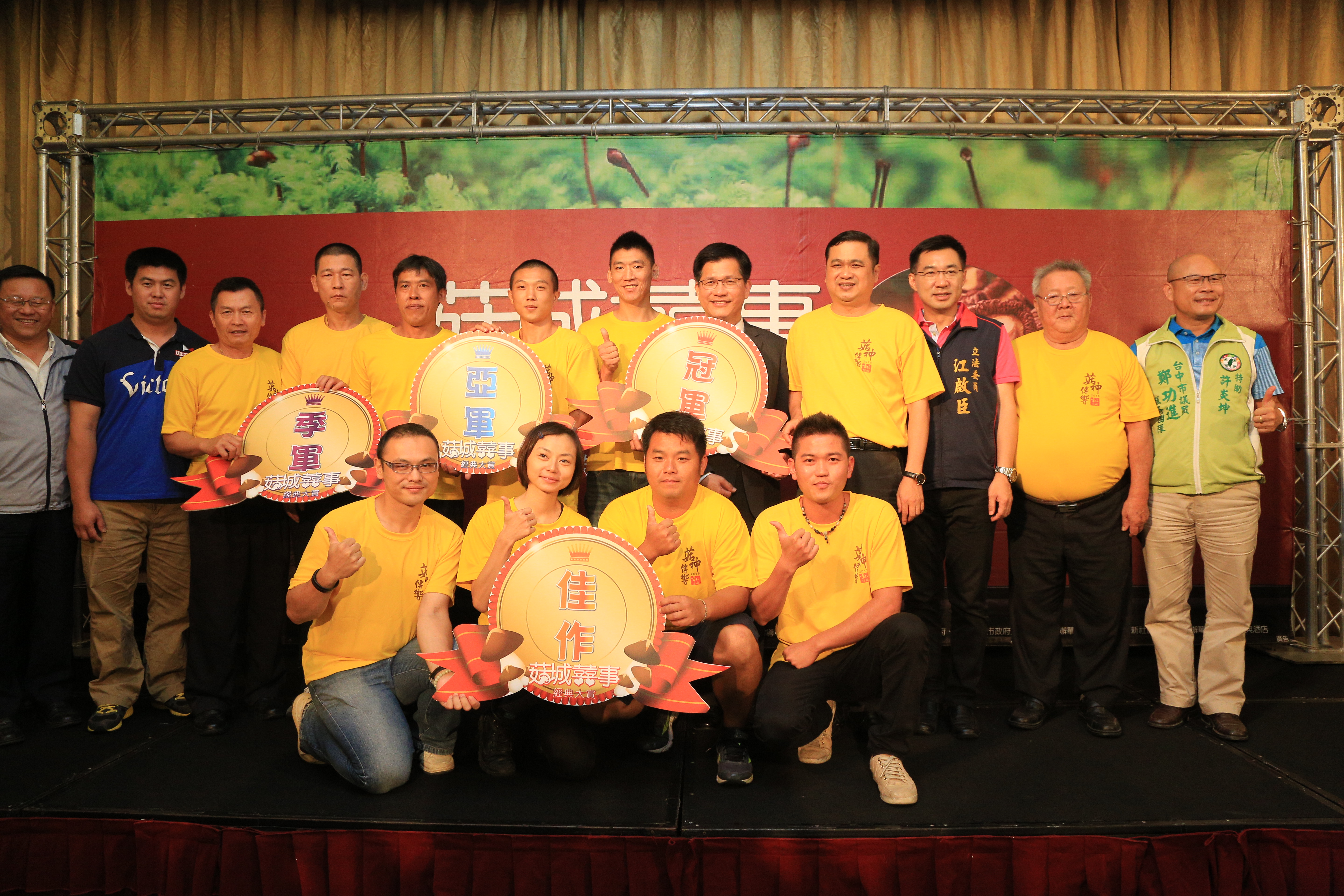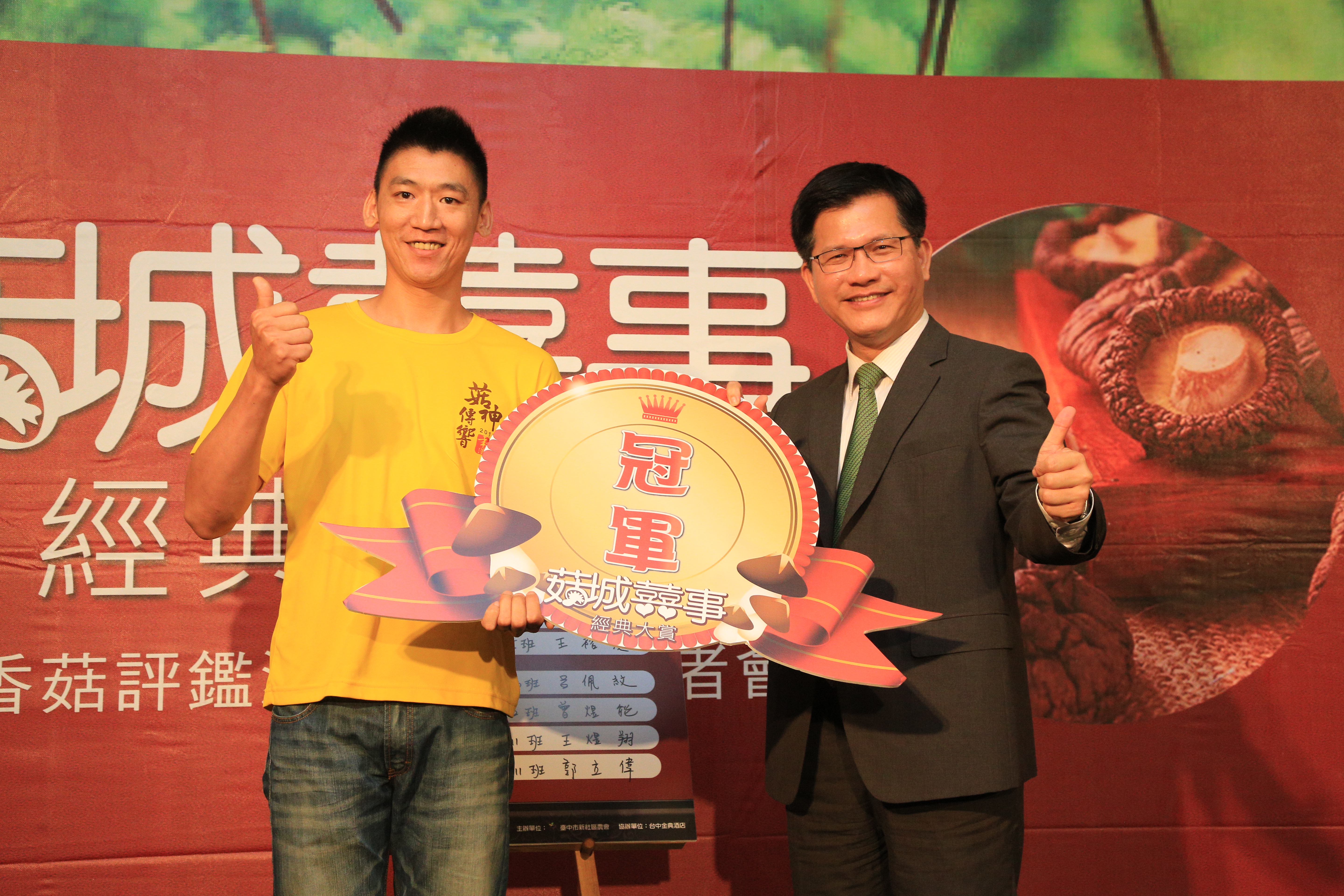 林市長也頒獎表揚香菇評鑑優質菇農,立法委員江啟臣等人也到場支持,總共評選出前3名及4名佳作,第一名由新社香菇產銷2班的劉原福先生獲得。此外,新社區農會也推出「小食覓」、「首露」以及「小菇煮意」三種新品,以全新口味、全新視覺包裝亮相,希望透過評鑑活動進一步行銷,打響新社香菇的品牌與知名度。