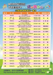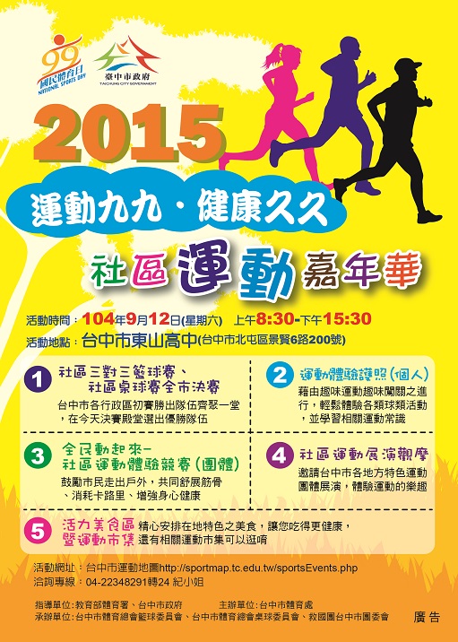此外,9月12日在東山高中舉辦「社區運動嘉年華」,有全市三對三籃球、桌球聯誼決賽、社區運動體驗競賽、個人運動闖關、免費體適能檢測,以及社區運動展演觀摩等活動。