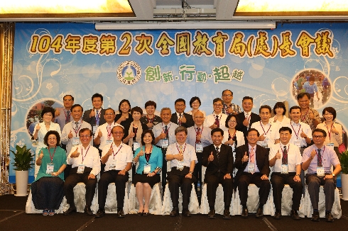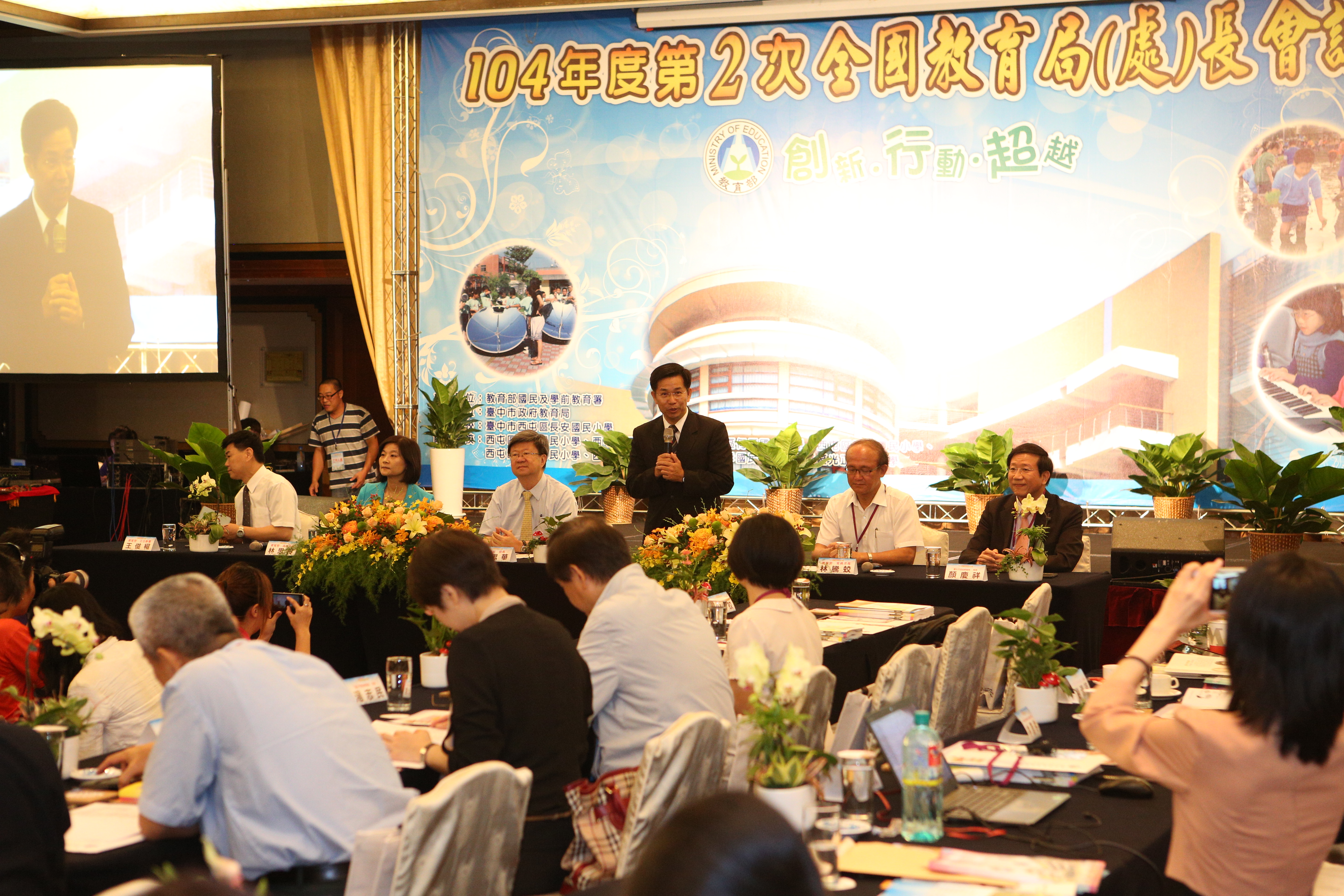 104年度第2次全國教育局(處)長會議,由台中市政府教育局承辦,今明兩天在台中金典酒店舉行;副市長潘文忠在教育局長顏慶祥的陪同下出席,教育部長吳思華也到場致詞。延續「教育創新行動年」意旨,今年以「創新‧行動‧超越」為主軸,教育部陸續推動許多創新計畫,全面推動翻轉教學,在創新教育的基礎上,推動實驗課程,卓越學生學習。
