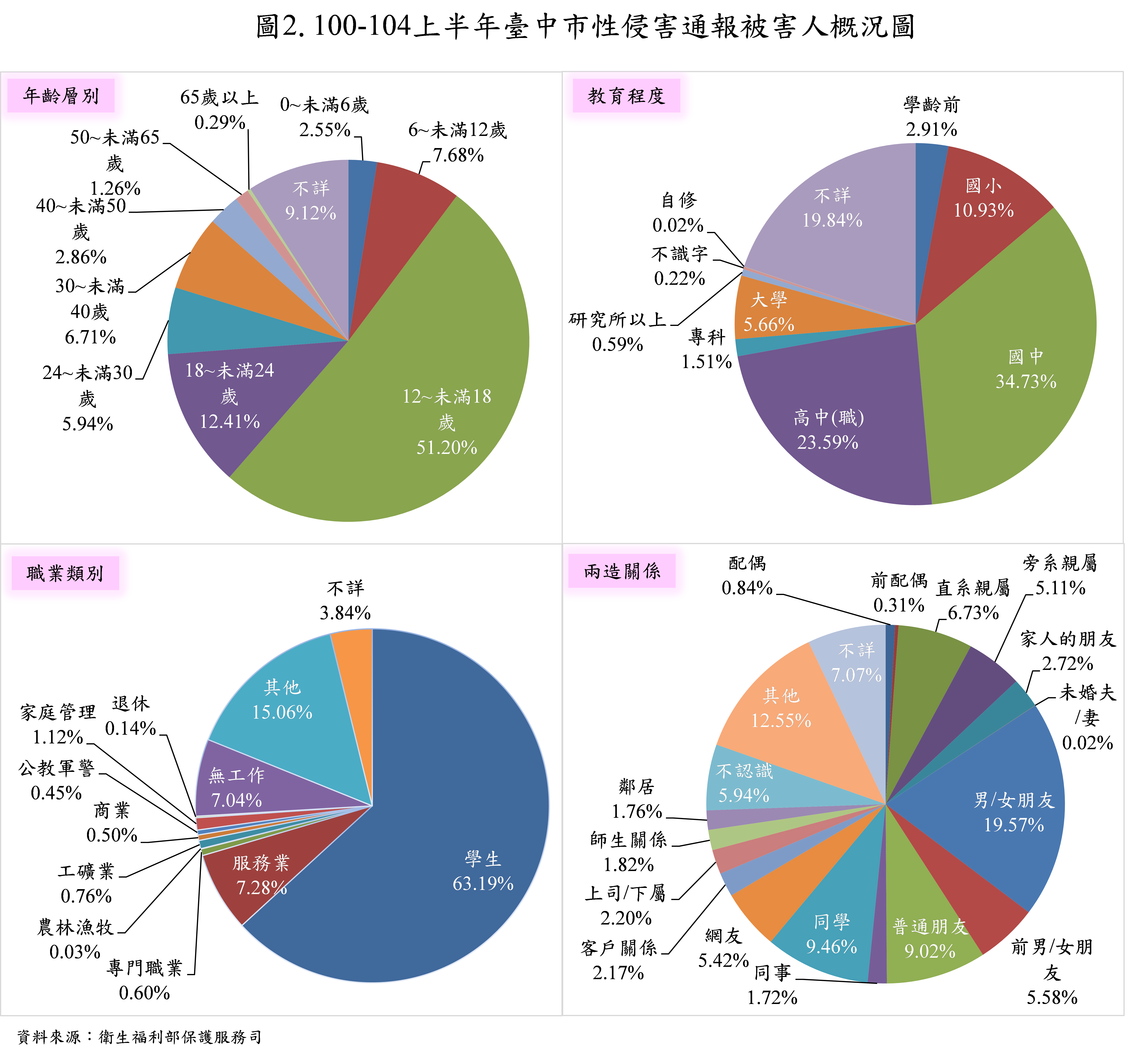 100年至104年上半年台中市性侵害通報被害人數總計5,811人,主計處表示,從年齡層別觀察,12至未滿18歲者占51.20%最多,18至未滿24歲者占12.41%次之,6至未滿12歲者7.68%再次之;依教育程度別來看,國中學歷者占34.73%最多,高中(職)學歷者23.59%次之,國小學歷者10.93%再次之。