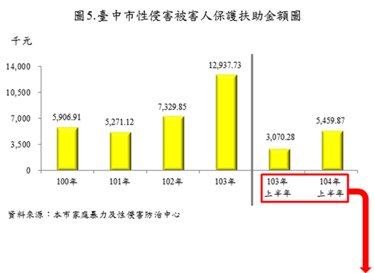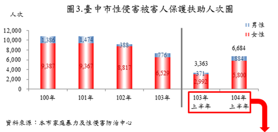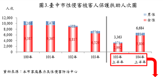 台中市政府主計處表示,市府積極強化防治通報網絡及支援措施,使被害人願挺身尋求協助,台中市性侵害通報被害人97年577人最低,之後逐年攀升,101年1,427人最高。