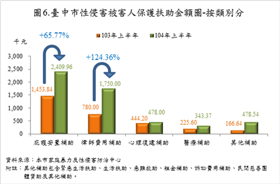 為協助被害人走出恐懼,修補心中傷痕,市府提供多項保護扶助措施,以諮詢協談5,070人次最多,占75.85%;心理諮商與輔導390人次居次,占5.84%。各類保護扶助金額為545萬9,868元,較去年同期增加77.83%,其中以庇護安置補助240萬9,958元最多,占44.14%;律師費用補助175萬元次之,占32.05%;心理復健補助47萬8,000元再次之,占8.75%。