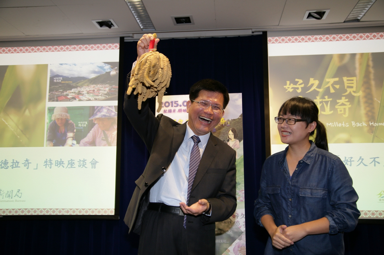市長林佳龍、新聞局長卓冠廷、原民會主委馬耀•谷木、和平區長林建堂,及資深泰雅族導演比令•亞布今日都參與映前座談及影片欣賞,邀請導演莎韻分享創作心得歷程,帶領觀眾找尋消失半世紀的「德拉奇(泰雅族語,小米之意)」。林市長贈送臘肉為莎韻加油,祝福她在10月份的日本山形國際紀錄片影展大放光彩、旗開得勝,為台灣、台中以及原住民族爭取更高的榮耀;而莎韻也回贈紀錄片主角雅鳳奶奶親手復育種植的小米,表示著祝福、友好與豐收共享。