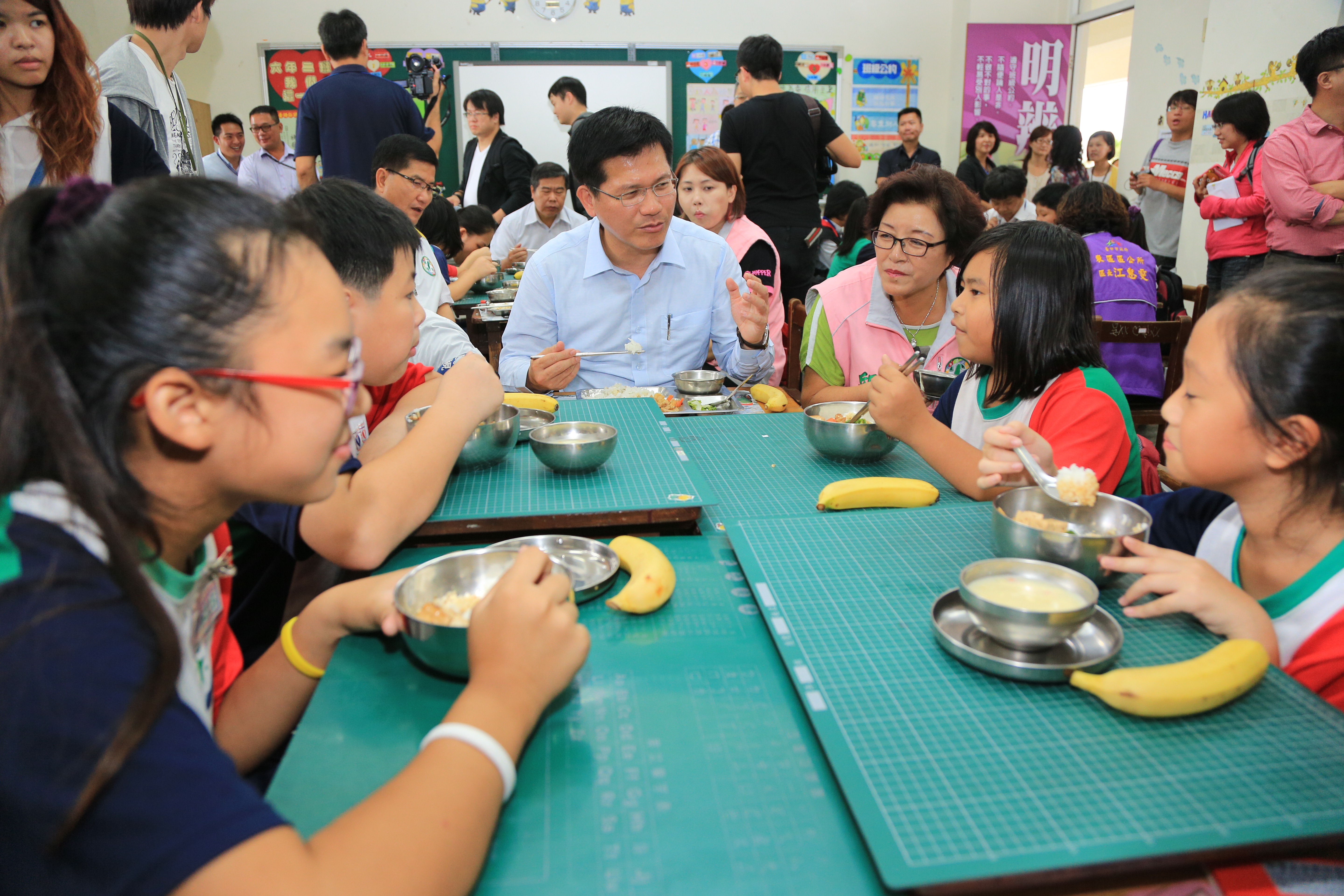 林市長今天在教育局長顏慶祥、衛生局長徐永年、農業局副局長蔡勇勝的陪同下,開心地與成功國小602班師生共進午餐,除實際瞭解學校午餐品質,也聽聽學生們對於午餐的想法,林市長邊吃飯邊與學生們聊天,氣氛溫馨歡樂。市議員何敏誠、楊典忠、邱素貞、賴佳微等人也到場關心。