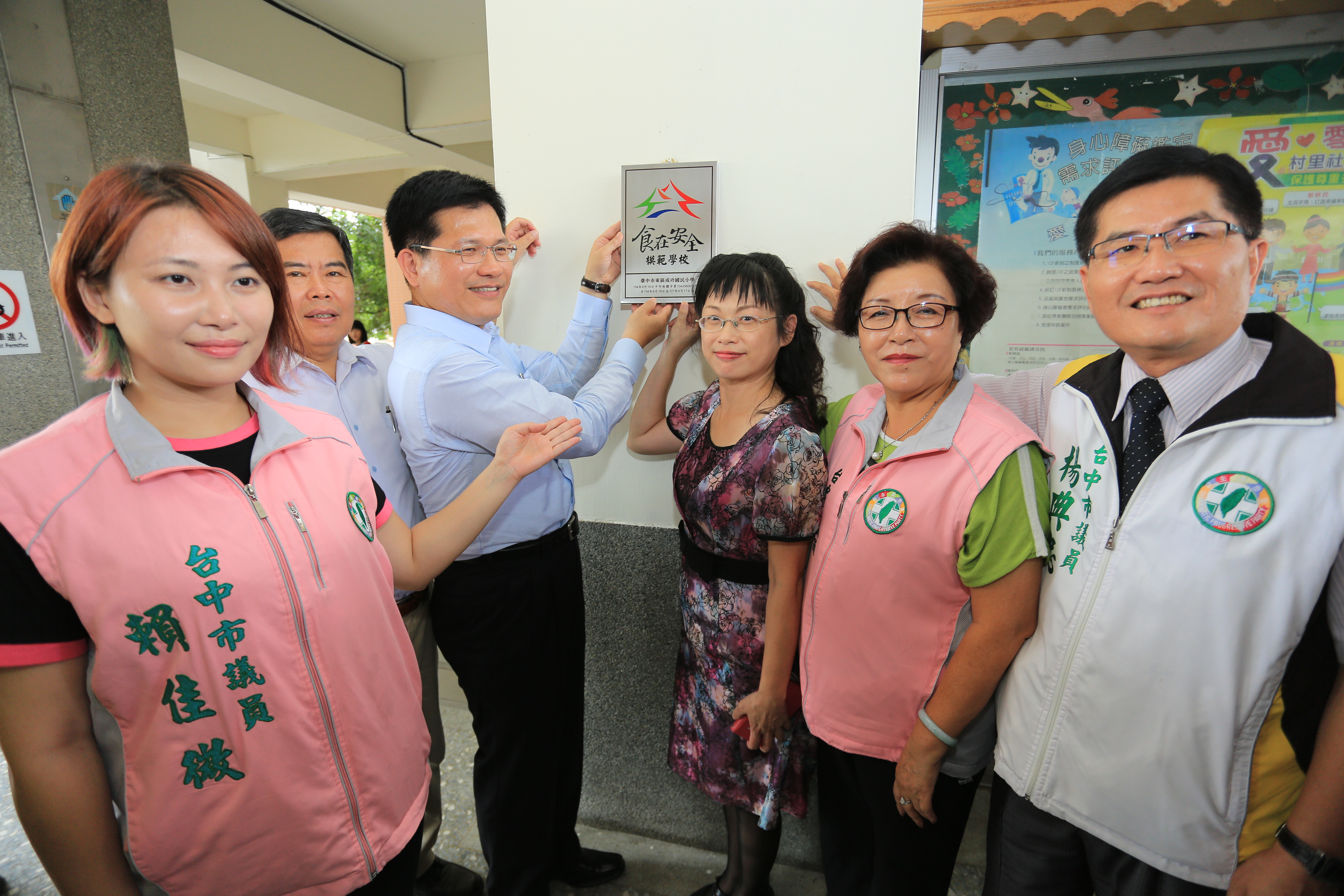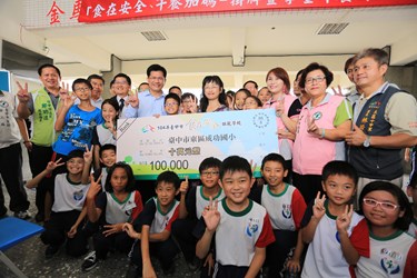 為加強校園食品安全,教育局辦理「食在安全模範學校」選拔活動,選出成功國小等6所模範學校,用完午餐的林市長,也到學校中廊為校方掛上「食在安全模範學校」的牌子,並頒發10萬元獎勵金,宣告該校成為台中市校園食品管理工作的模範學校。