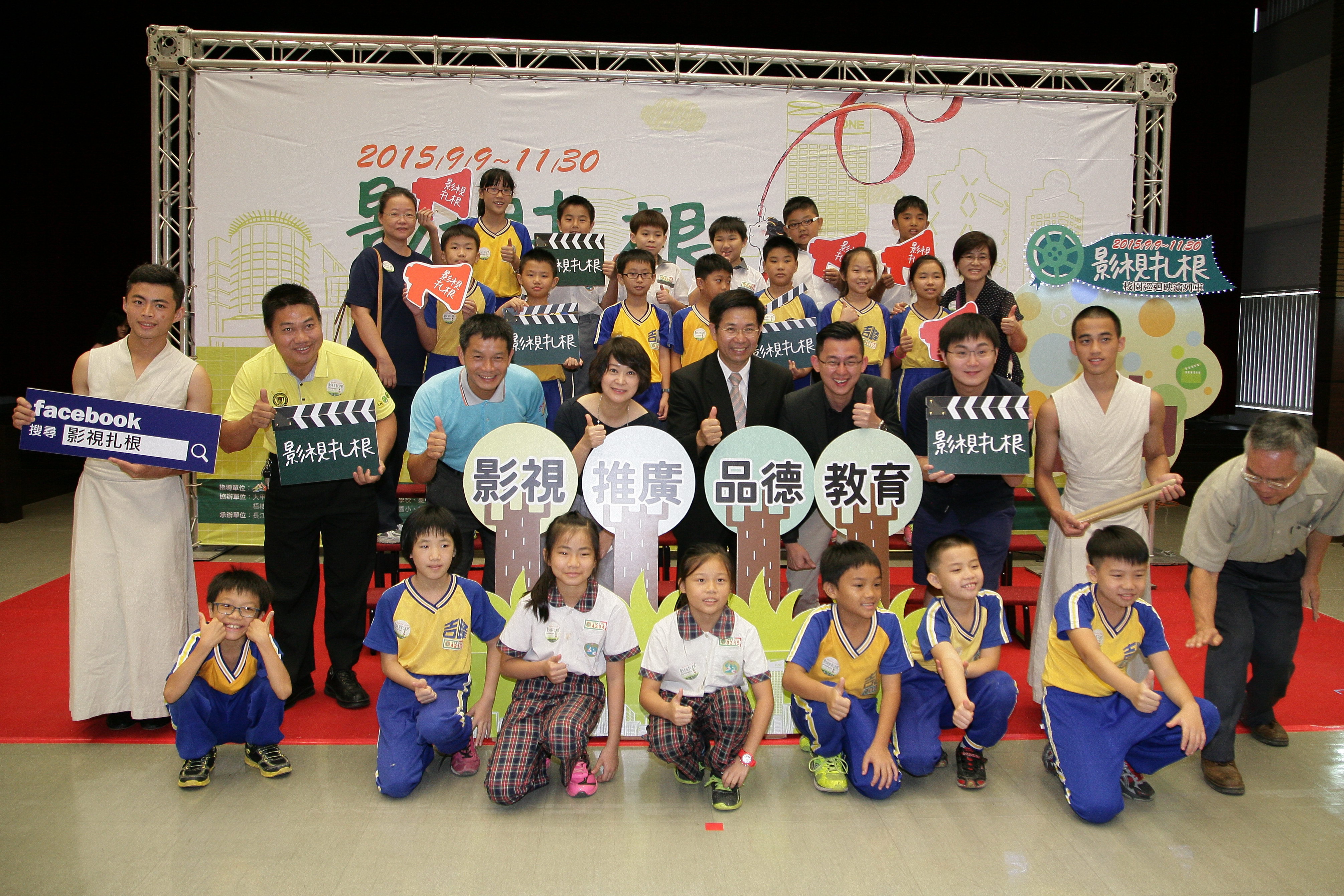 台中市政府新聞局今(3)日於新市政大樓舉行「2015影視扎根校園巡迴映演列車」記者會,邀請電影紀錄片《少年鼓手》的主角群林建志、古文全以及優人神鼓培訓計畫的鼓手們,帶來精彩的鼓曲表演;《極光之愛》導演李思源、監製王月以及台中市副市長潘文忠、新聞局長卓冠廷、市議員劉士州也到場參與。