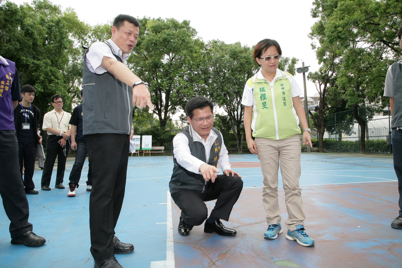 林市長在民政局主任秘書謝文浩、潭子區長劉振村、潭陽里長林國印的陪同下,共同前往石牌公園視察,市議員張雅旻也到場關心。石牌公園籃排球場鋪面龜裂破損情形嚴重,修繕預估經費128萬1,000元。