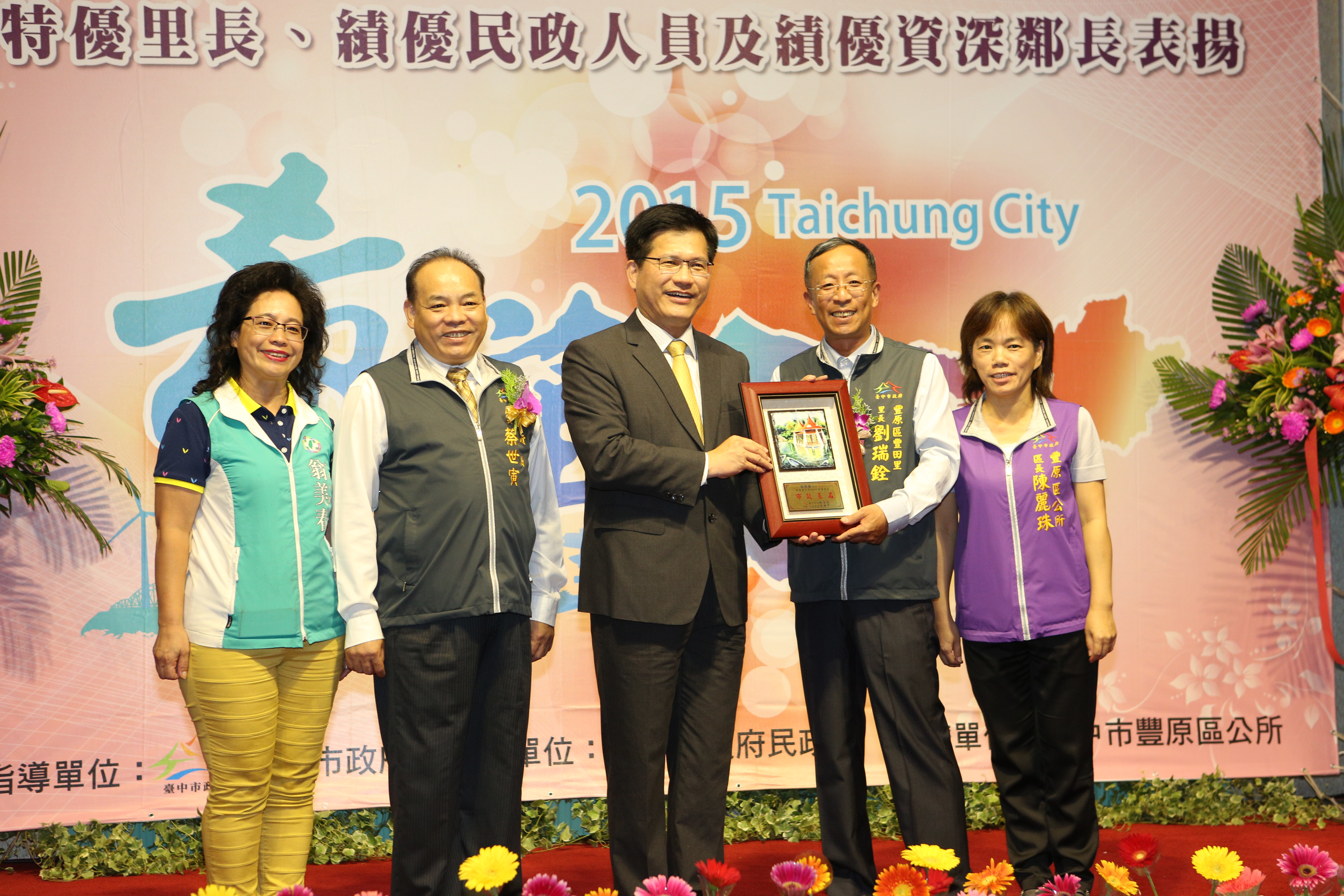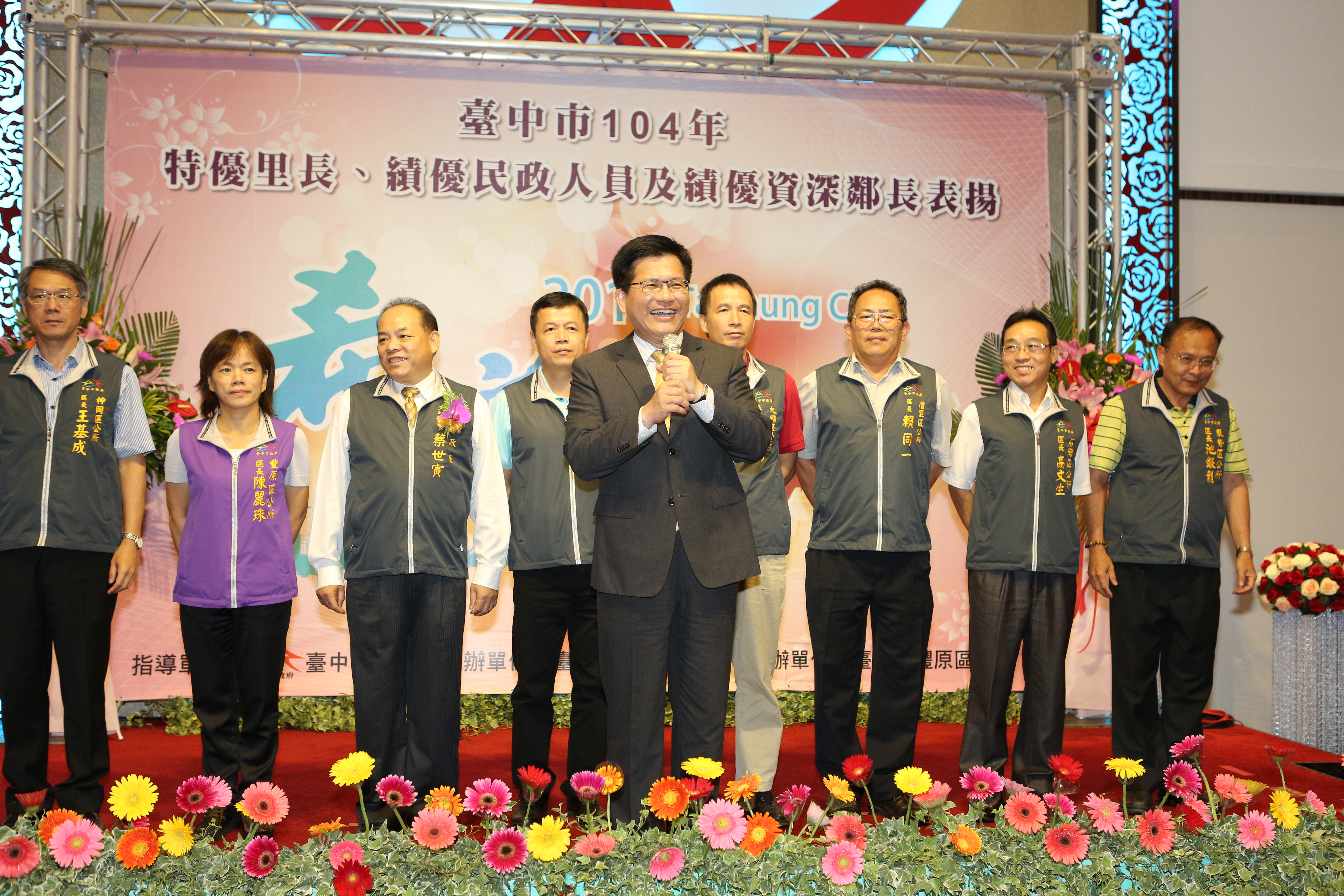 為強化基層組織,發揮里鄰服務功能,台中市政府民政局今年分4場次辦理「104年特優里長、績優民政人員及績優資深鄰長」表揚大會,第4場次今日下午在豐原區舉行,計有15位特優里長、12位績優民政人員、199位績優鄰長及55位資深鄰長,共281位獲獎,包括林市長、民政局長蔡世寅、市議員翁美春、陳本添、立法委員楊瓊瓔及多位區里長均到場共襄盛舉,場面盛大隆重。