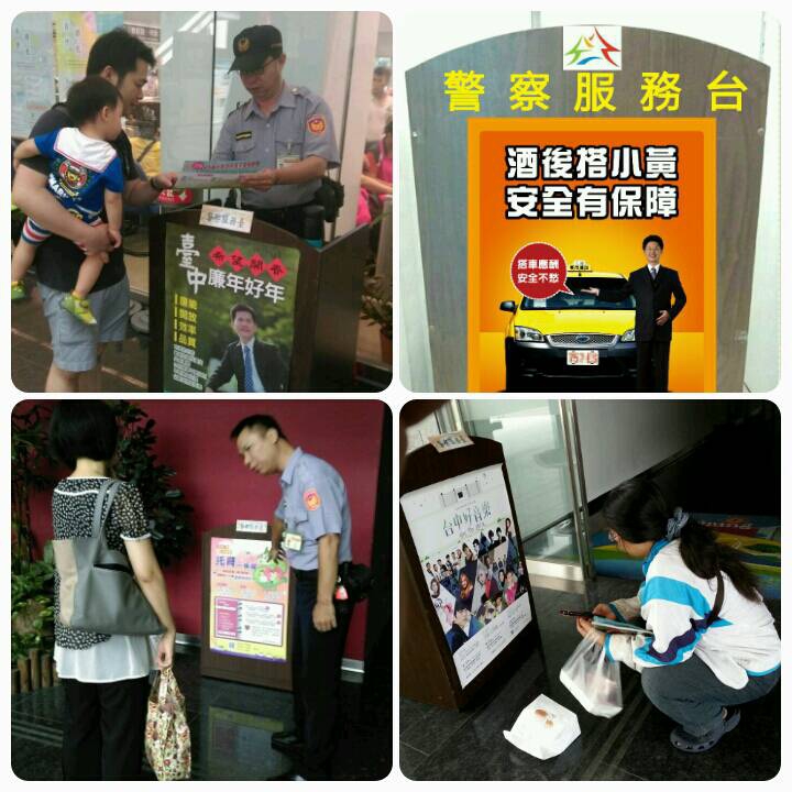 日前一位民眾經過行動服務台,看見服務台上張貼的「2015台中好音樂」海報時,則立即記下音樂會場次時間,表示要與家人前往欣賞聆聽,並把資訊告訴更多親朋好友。而警察值勤崗哨的行動服務台,在張貼相關活動宣傳海報後,也褪去嚴肅的感覺,顯得親民許多,也獲得民眾稱許。(8/31*11)