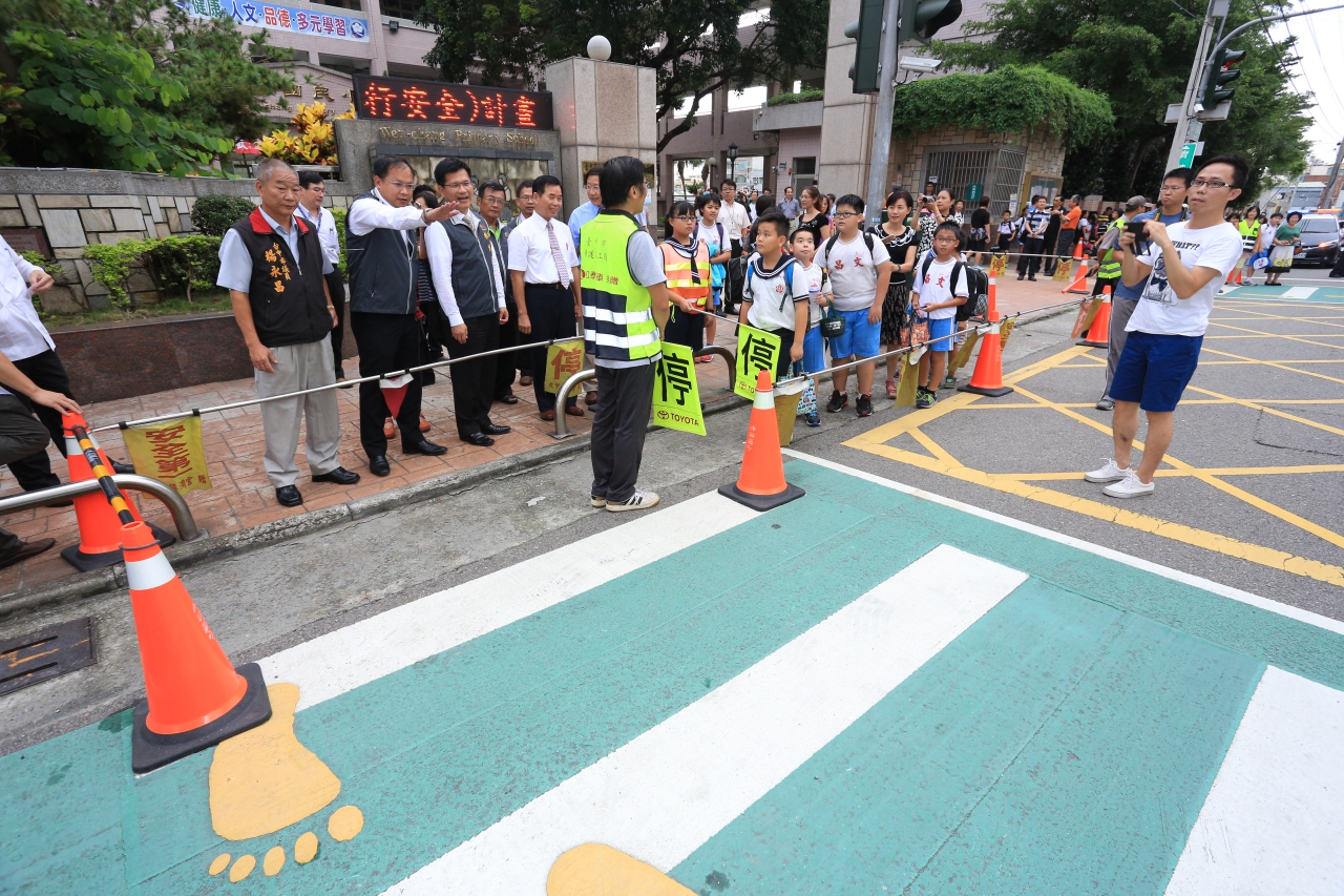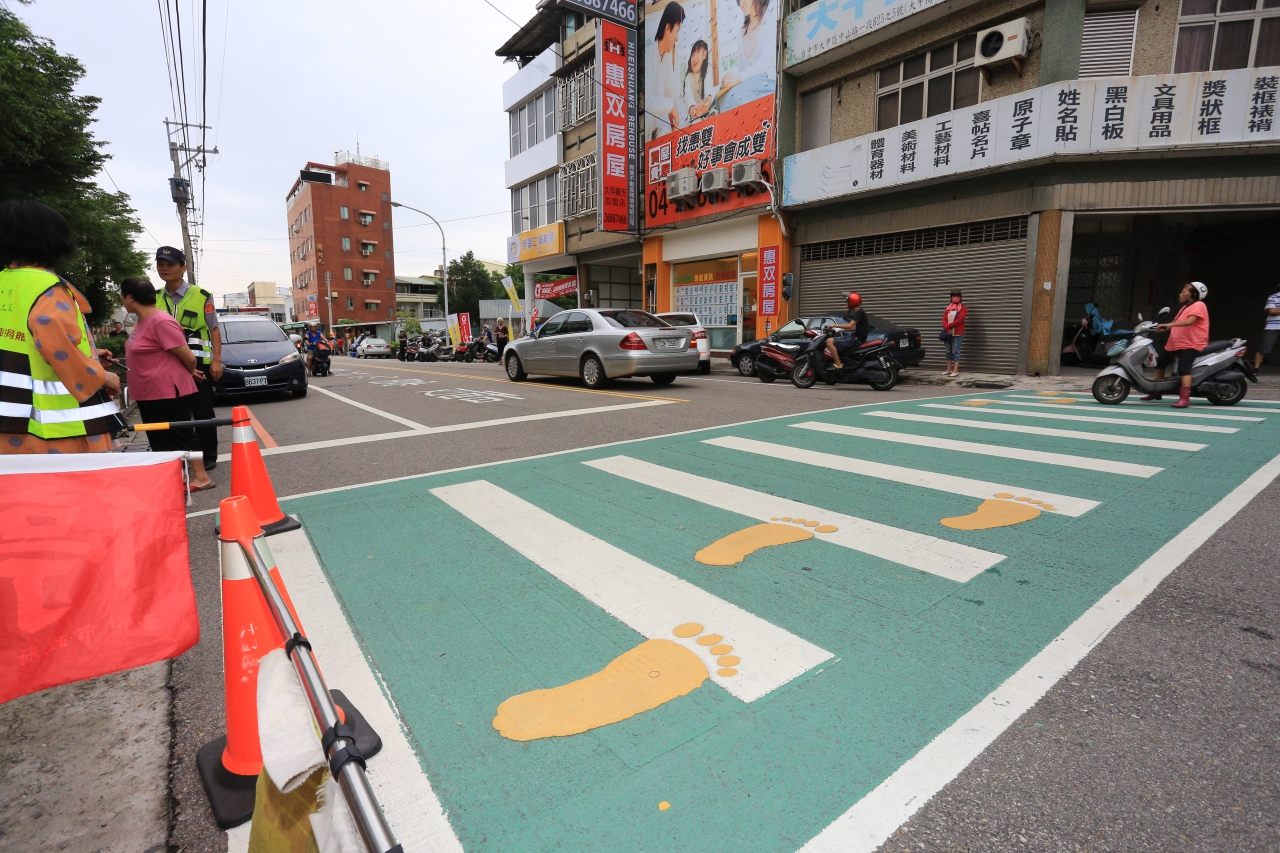 王局長說明,市府已於今年4月完成大甲區、大安區、外埔區、梧棲區、清水區、大肚區、沙鹿區等30處國中、國小旁路口行人優先路權線劃設,以綠色鋪面加黃色腳丫來突顯行人路權,提升交通安全,希望藉由色彩視覺的輔助,提高用路人對於道路環境及路權的識別性和警覺性,進而提高安全性,同時美化都市景觀。