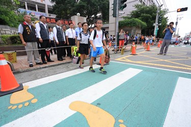 王局長表示,台中市參考日本行人標線作法,在原有的枕木紋行人穿越道線旁再加上兩道行人優先路權線,明確區分行走範圍;同時也參考「道路交通標誌標線號誌設置規則」修訂的人行道鋪面顏色,以代表環保優質的綠色為基底鋪設,並在路口兩端加上全台首創的黃色腳丫子,告知用路人行走方向,也象徵該區域為行人專屬空間,強調行人路權範圍。目前先以學校周邊及商圈等人潮聚集處作為優先施作對象。
