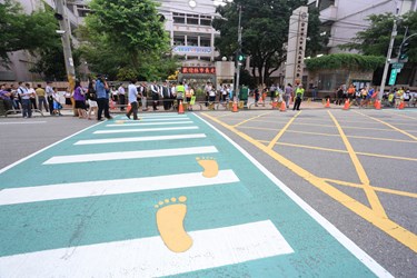 因應開學季,市府啟動學安計畫。有鑑於學校周邊是學童主要通行處,為維護交通安全,市府藉加畫行人優先路權線、以綠色做為人行道鋪面基底色、路口兩端路面增加黃色腳丫標示等方式,強調行人路權範圍,維護行人通行安全。