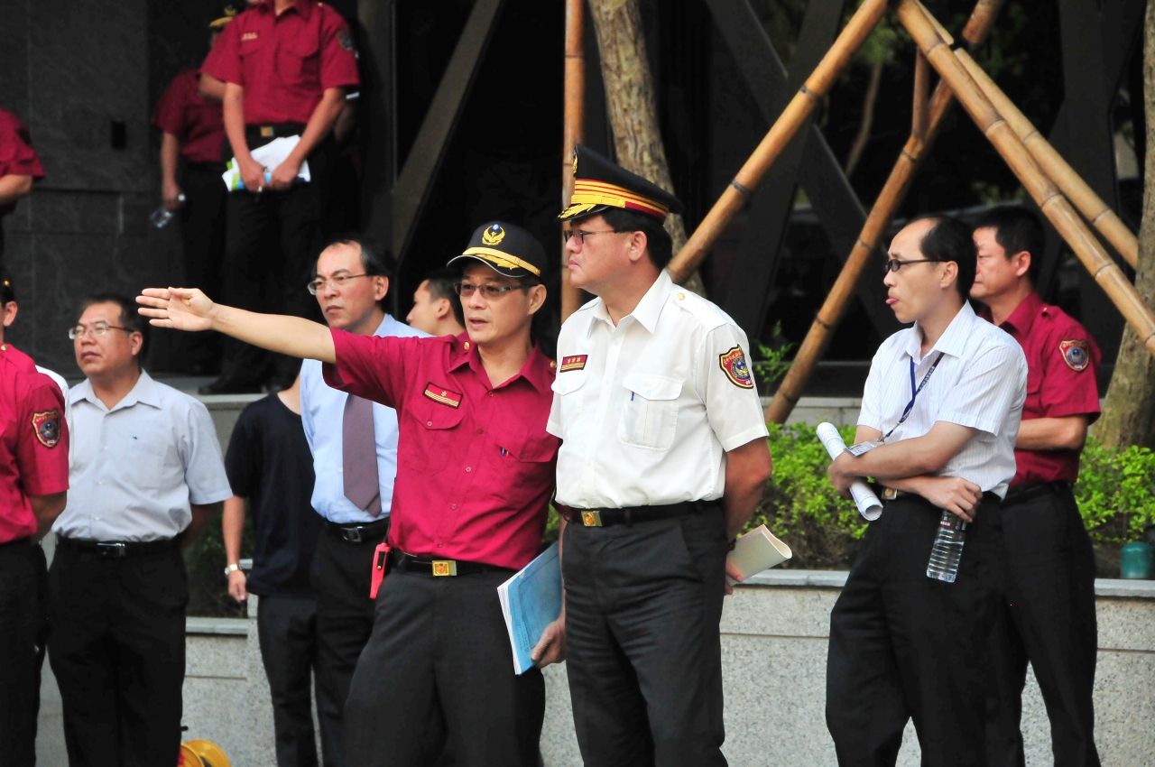 今天演練由消防局副局長曾進財親自帶隊進行,透過美國事故現場指揮與控制作業原則,分為作業組、計畫組、後勤組等主要控制組,並由指揮站、大樓防災中心監控、一樓人員裝備管制站、前進指揮所、緊急應變小組等明確分工作業,事故現場指揮官可專注擬訂救災策略,戰術的運用與執行則交由各控制組長判斷,同時遵守單一指揮原則,也就是每個人員只接受一位指揮人員指揮,可明確知道自己的上屬為何人的階層式管理作業概念。