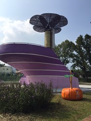 由經發局主辦的「i上新社˙紫色香戀」嘉年華活動今(12)日啟動,為添增新社商圈的藝術氣息,星願紫風車園區現場設有3座新社特有栗南瓜製作成的裝置藝術,並將長期展覽為園區增添藝術色彩。