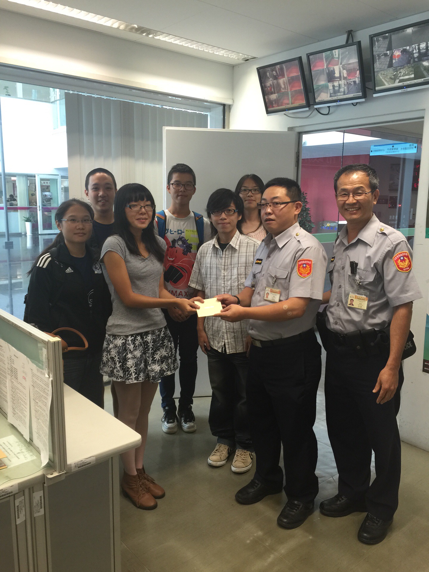 台中市警察除維護治安外,對關懷民眾的貼心服務也不遺餘力。日前府會園區警察隊長林騰瑜得知一群學生為準備暑期公演,在市府廣場認真反覆演練,立即請值勤員警協助提供飲水、廁所借用相關服務,並疏導廣場通行人潮;公演結束後,學生特別前來市府致贈員警感謝函,感謝他們的支持與關心。