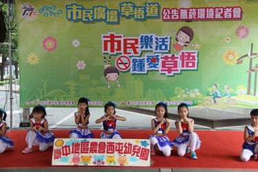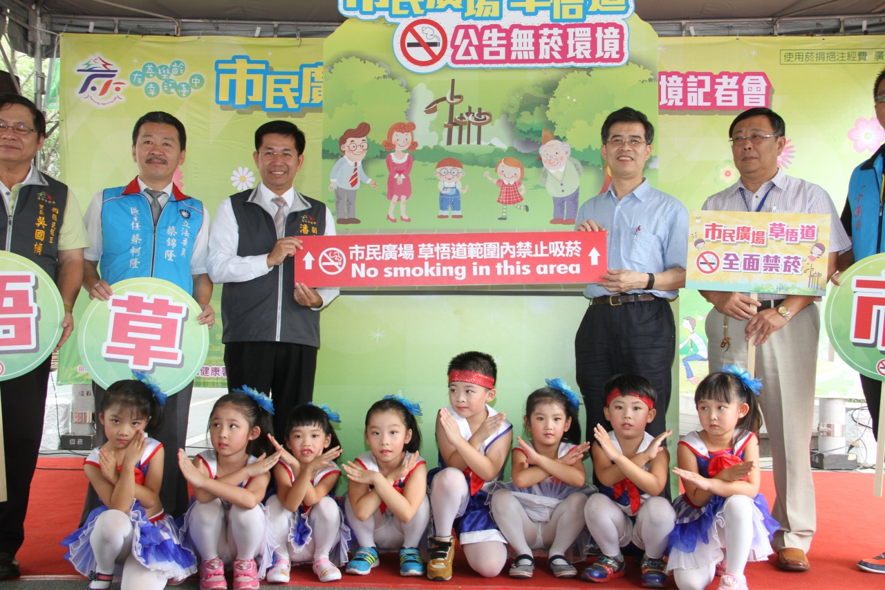 「市民廣場、草悟道公告無菸記者會」今日在草悟道A段舉行,副市長潘文忠、衛生局長徐永年及建設局副局長臧澎田及多位來賓,共同宣示市民廣場與草悟道全面禁菸,展現中市公共場所拒絶二手菸害的決心。
