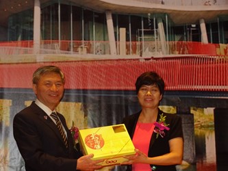 張副市長致贈廈門市總工會副主席陳超英台中名產太陽餅,並祝福他們一行人來台中除了論壇,也能有個愉快的旅程。